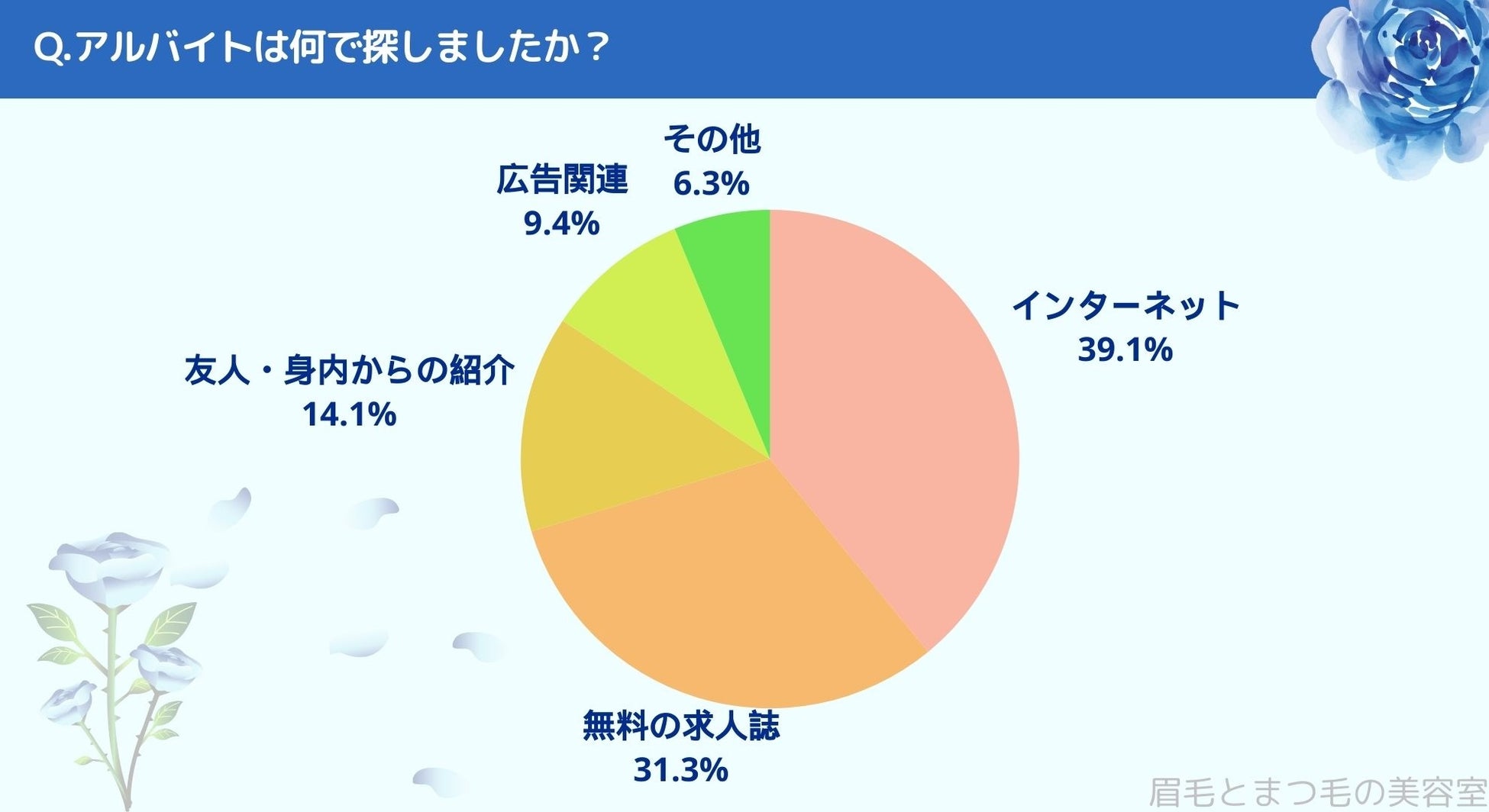 アルバイトを何で探したかお聞きしたところ「インターネット(39.1%)」、「無料の求人誌(31.3%)」、「友人・身内からの紹介(14.1%)」、「広告関連(9.4%)」、「その他(6.3%)」という結果になりました。