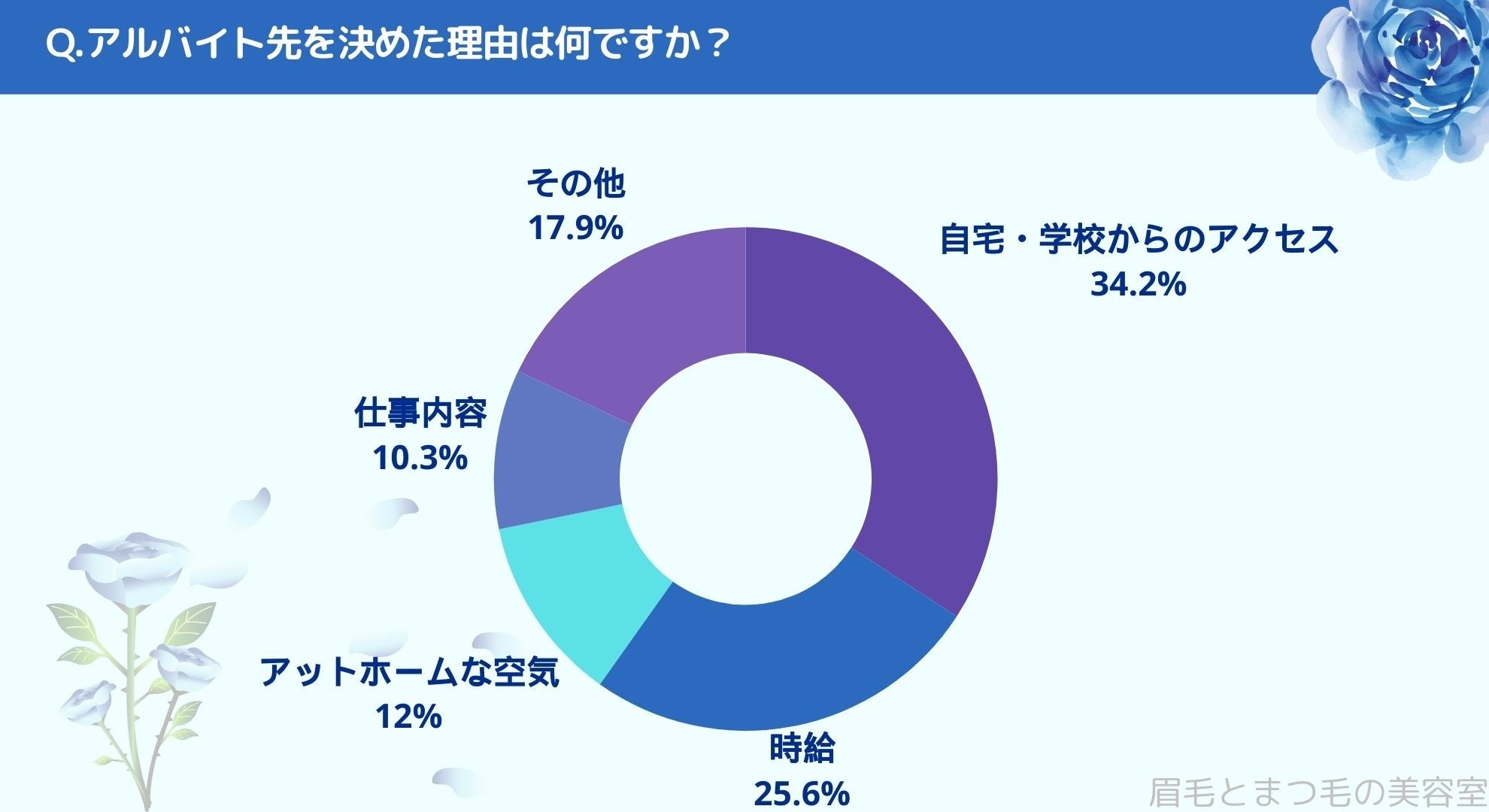 アルバイト先を決めた理由をお聞きしたところ「自宅・学校からのアクセス(34.2%)」、「時給(25.6%)」、「アットホームな空気(12%)」、「仕事内容(10.3%)」、「その他(17.9%)」という結果になりました。