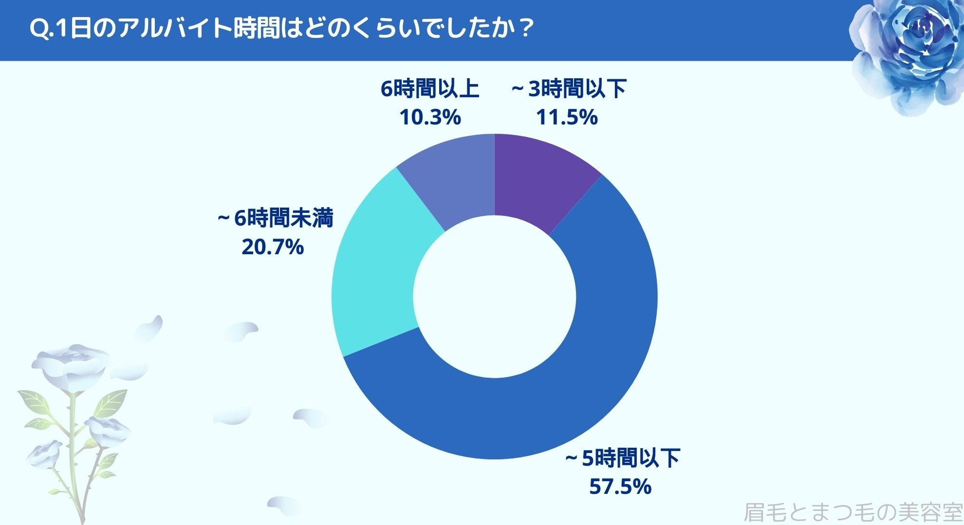 1日のアルバイト時間をお聞きしたところ「~3時間以下(11.5%)」、「~5時間以下(57.5%)」、「~6時間未満(20.7%)」、「6時間以上(10.3%)」という結果になりました。