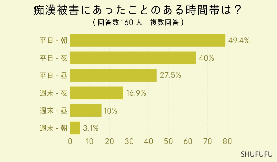 痴漢被害に一番遭いやすい時間帯は?痴漢被害にあわないためのアドバイスや対策について被害経験者160人に聞きました