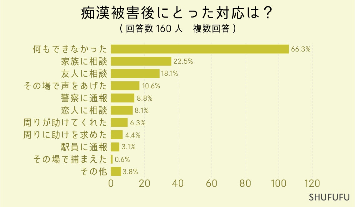 痴漢被害後にとった対応では「何もできなかった」が多数派でした。突然のことで助けを呼んだりすることが難しい場合もあります。対策としてブザーやアプリを利用することもいいかもしれません。
