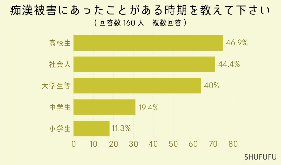 痴漢被害にあったことがある時期では「高校生」と答える方が1番多かったです。まだ未成年の学生を狙うのはとても卑劣な行為で許せないですね。