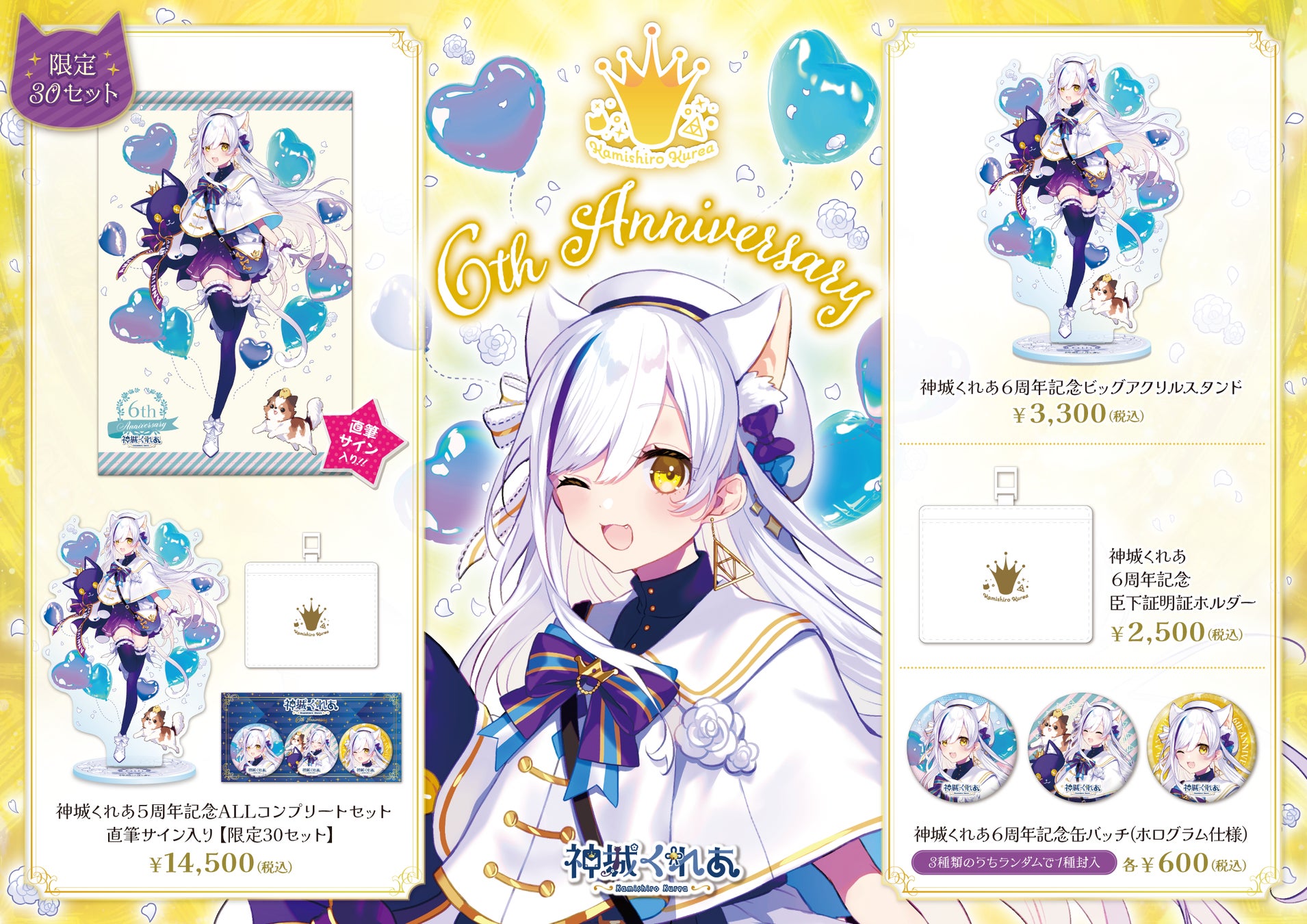 その「神城くれあ Online Store」で、6周年記念オリジナルグッズを11月9日より販売を開始いたします。ALLコンプリートセットは数量限定になりますので、お買い求めはお早めに!!