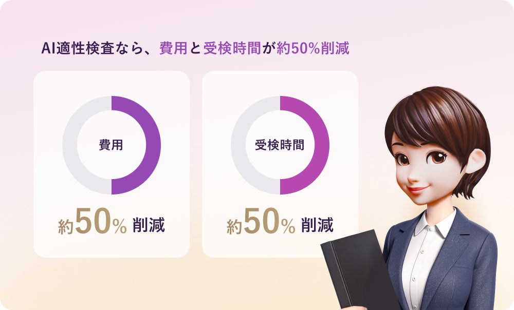 従来の適性検査はおおよそ、候補者1人あたり3000円〜5000円、1回あたり40分〜60分を要するところ、約半減のコストダウンを実現可能です。24時間365日受検可能であることによる、候補者の負担軽減、リードタイムの短縮にもつながります。