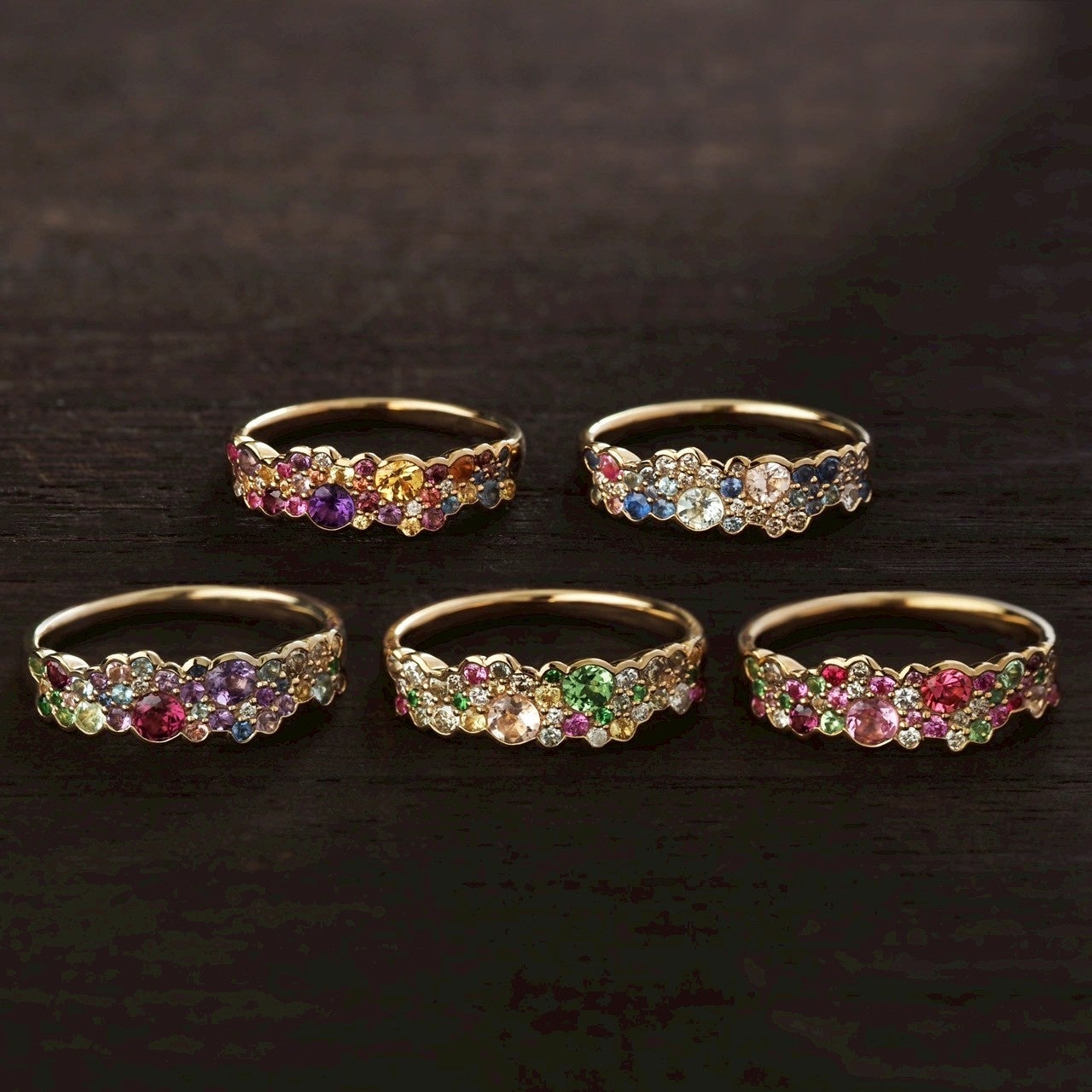5周年を記念し、横浜店限定の新作ジュエリー「シュシュ」(Chou Chou ― お気に入りの意)を発表いたします。パーセル ジュエリーの石川(@parcelle_momona)が配色を担当しました。シュシュは、5周年にちなみ、5枚の花弁を模したデザインを採用。四季の移り変わりを色彩で表現し、様々なカラーストーンを組み合わせた華やかなリングです。自由な配色と個性豊かなカラーストーンがぎゅっと詰まったシュシュをぜひご覧ください。また、お好きな指に合わせたオーダーも承っております。