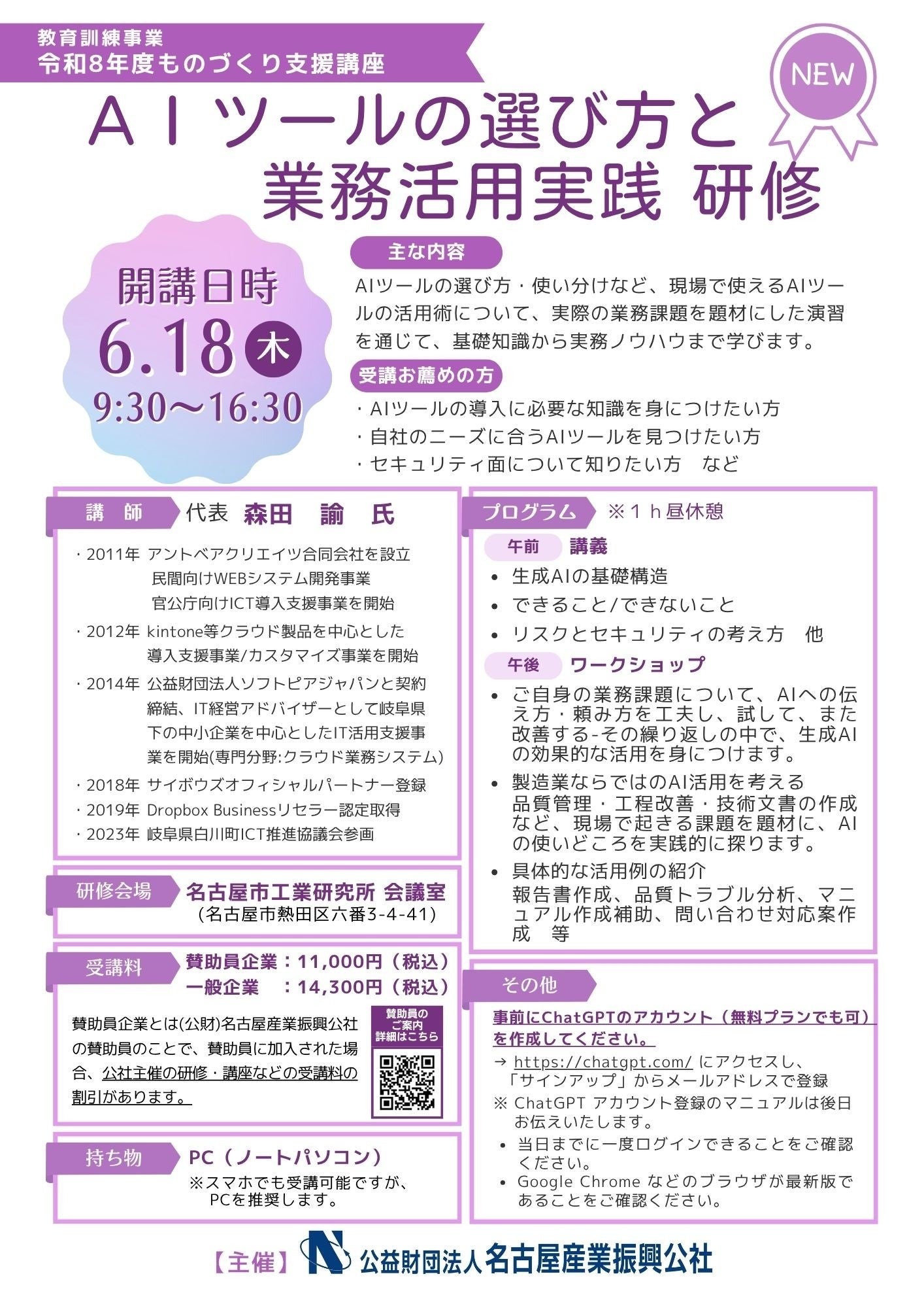 教育訓練事業 令和8年度ものづくり支援講座『AIツールの選び方と業務活用実践 研修』