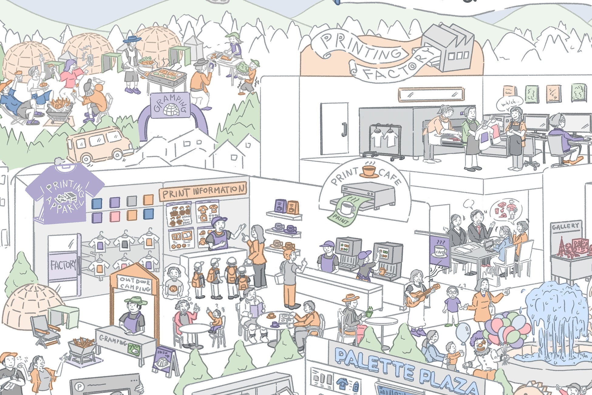 手前部分には、2022年夏に発表した、プリント工房とカフェが一体化した新拠点。東京・神宮前に今秋オープンするリアルな店舗では、日本初導入となるイスラエル製の特別なプリンターを軸に、アパレル企業のみなさまと協力しながら、サステナブル×ファッションへの解を見つけていきます。また、奥手にはドーム型のグランピング施設があります。「写真に残したくなる瞬間が生まれる体験そのものからプロデュースしたい」との想いから参入を決めたグランピング事業。2022年10月、長野県飯島町で『アルプスBASE』を誕生させ、今後も拠点を増やす予定です。