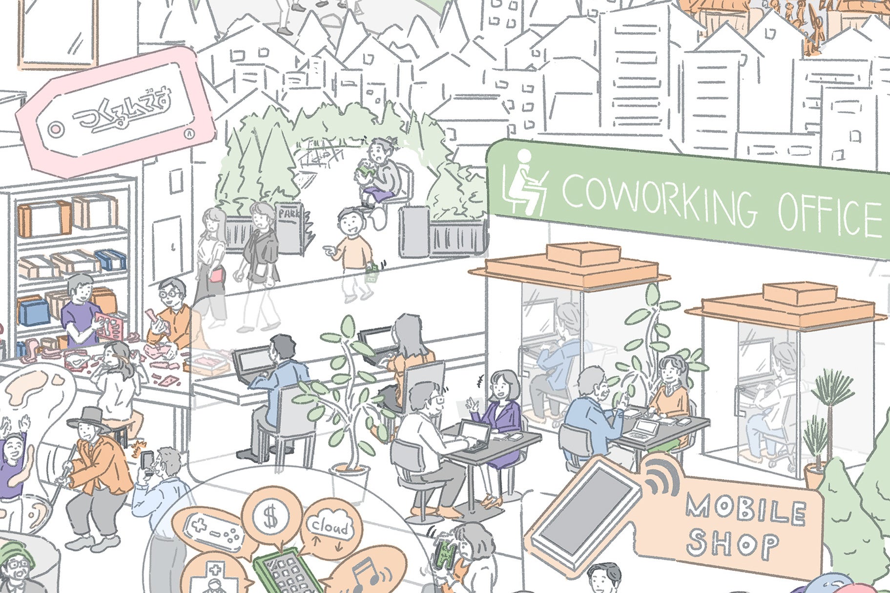 左手には、DIYキットブランドの『つくるんです®︎』を囲む人々が。3Dウッドパズルやミニチュアハウスなど、「つくる楽しさ」を共有しています。右手には、オフィスでのWeb会議を快適にする、パーソナル・ミーティング・ボックスの『One-Bo』を利用する人の姿も。『One-Bo』の中では、ビジネスパーソンたちが国内外のお客様とつながっています。