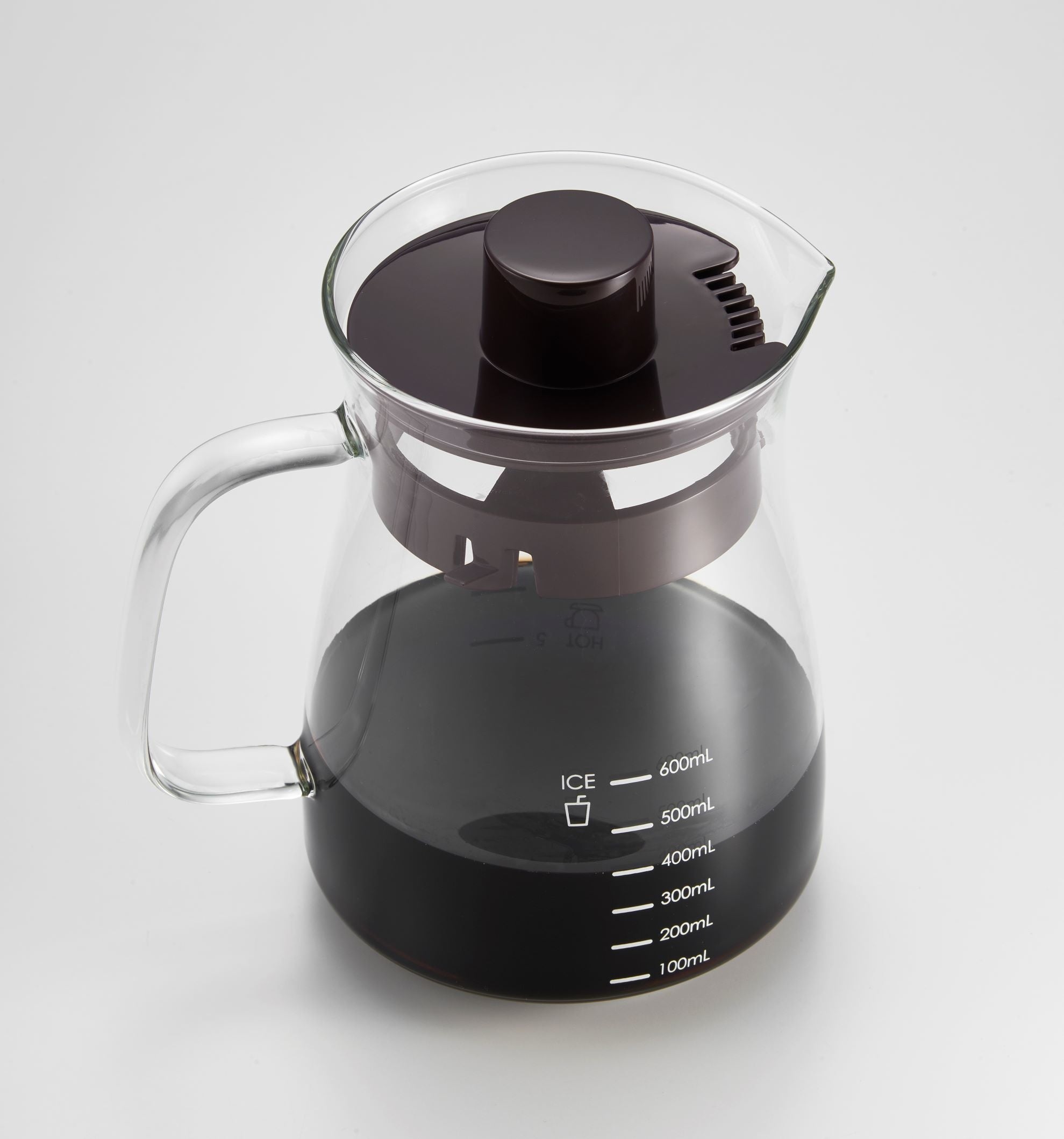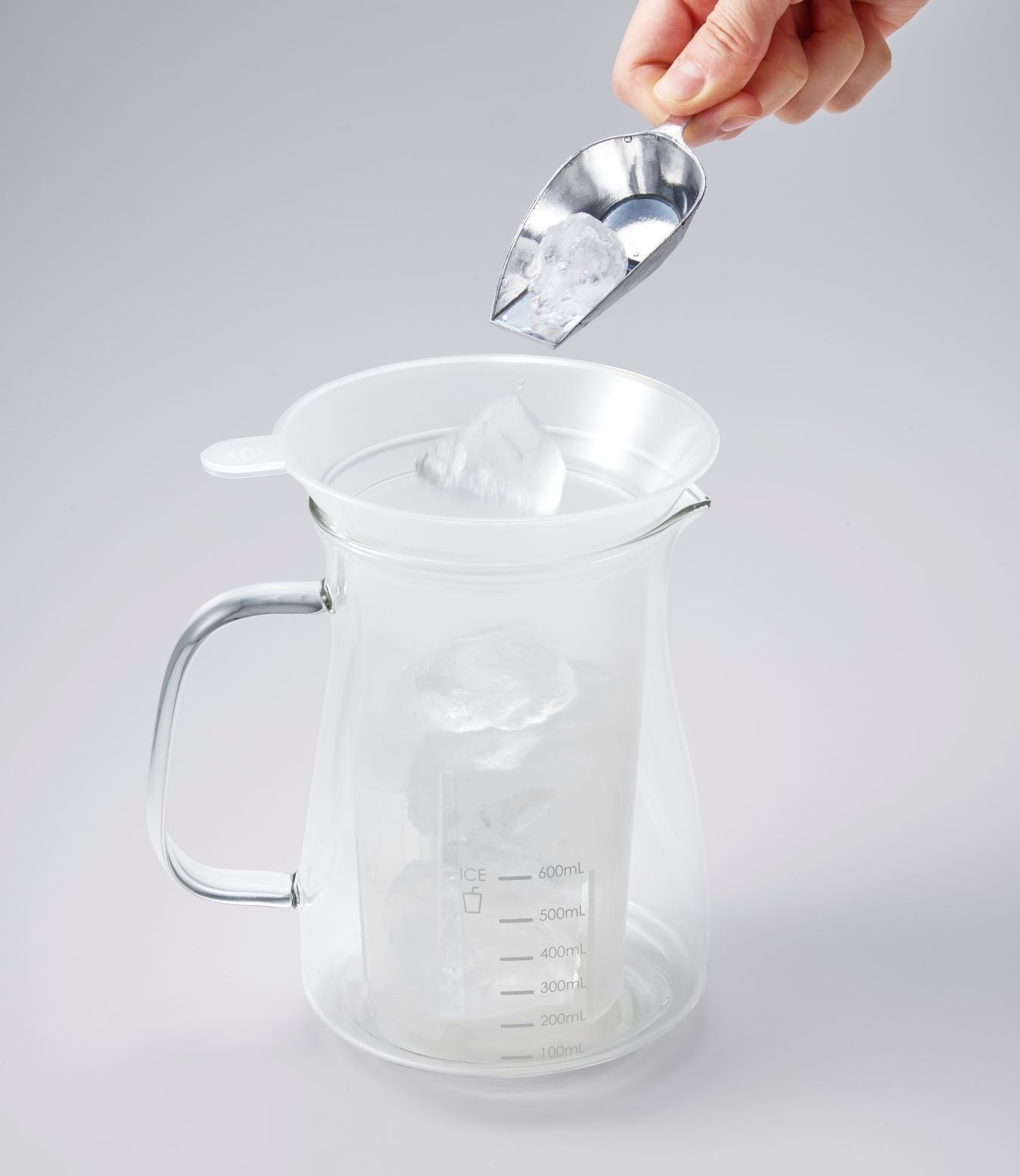 付属のアイスケースに氷を入れて、ガラスポットにセットし、「ICE」ボタンを選択すると抽出開始。ドリップしたてのコーヒーを急冷することで、淹れたての香りを封じ込めた透明度の高いアイスコーヒーが楽しめます。ガラスポットはふた付きで、残ったアイスコーヒーをそのまま冷蔵庫に保存することもできます。