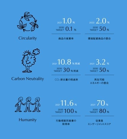 2020年4月、当社はサステナビリティ推進の指針として5つのテーマと16のマテリアリティを定めました。さらに、今年8月、2030年に向けた3つの活動目標:「Circularity(循環するファッション)」、「Carbon Neutrality(カーボンニュートラルな世界へ)」、「Humanity(健やかに働く、暮らす)」と、この3つのカテゴリーに紐づく数値目標を設定しました。これらの目標にはステークホルダーの皆様からの関心が高く、当社やファッション業界が持つ課題として特に注目されている項目を選定しています。