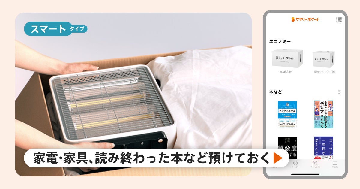 サマリーポケットは1箱330円〜のお手頃価格で、モノの預け入れから取り出しまで全てアプリ・Webで完結できる宅配型の収納サービスです。専用ボックスに預けたい荷物を詰めて送ると、空調・セキュリティが徹底管理された環境でお預かりをし、荷主自らが足を運ぶ従来のトランクルームとは異なり、宅配便を活用することで居住地域に関係なく、預けたモノを確認したいときも、取り出したいときも、自宅にいながらスマホ一つで操作が可能になります。