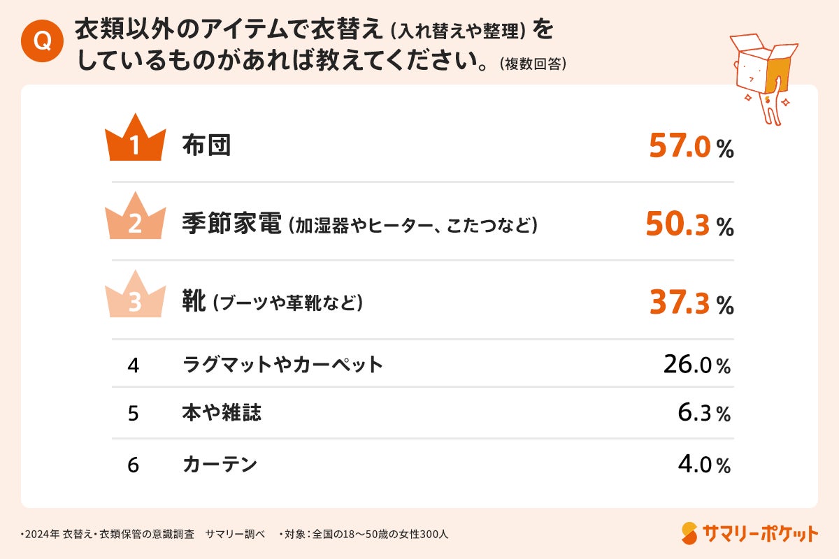 また「衣類以外のアイテムで衣替え(入れ替えや整理)をしているもの」について尋ねると、布団が最も多く(57.0%)、季節家電(50.3%)、ラグマットやカーペット(26.0%)なども衣替えを行なっているという結果になりました。