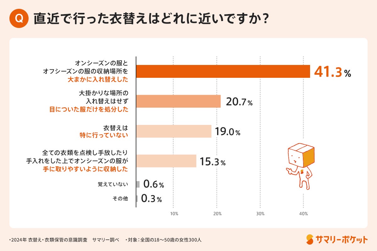 「オンシーズンの服とオフシーズンの服の収納場所を大まかに入れ替えした」が41.3%で最も多く、次に「大掛かりな場所の入れ替えはせず、目についた服だけを処分した」が20.7%、「衣替えは特に行っていない」が19.0%という結果になりました。