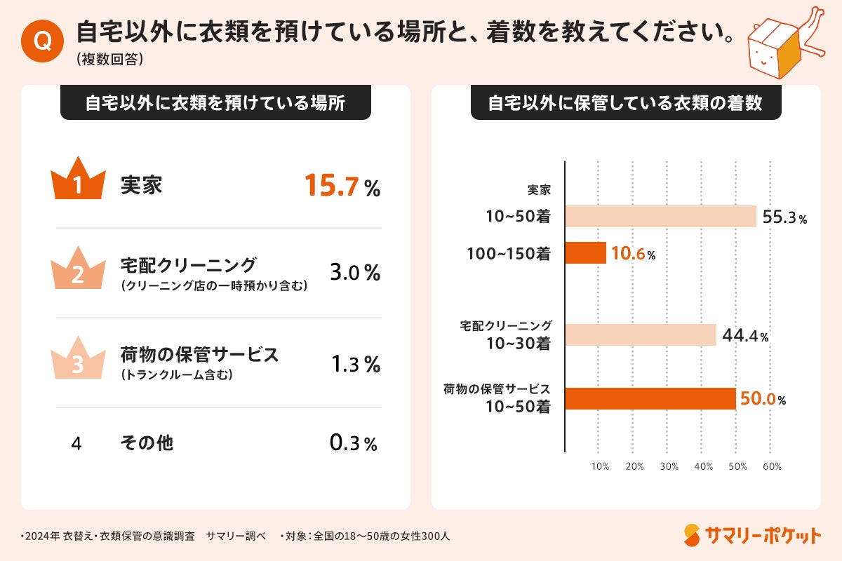 株式会社サマリー(本社:東京都千代田区、代表取締役:日下部康介)が運営する、宅配収納サービス「サマリーポケット」では、荷物の収納・管理に関する市場調査を定期的に行っており、この度「衣替え・衣類保管に関する調査」を全国の18〜50歳の女性300名を対象に実施しました。