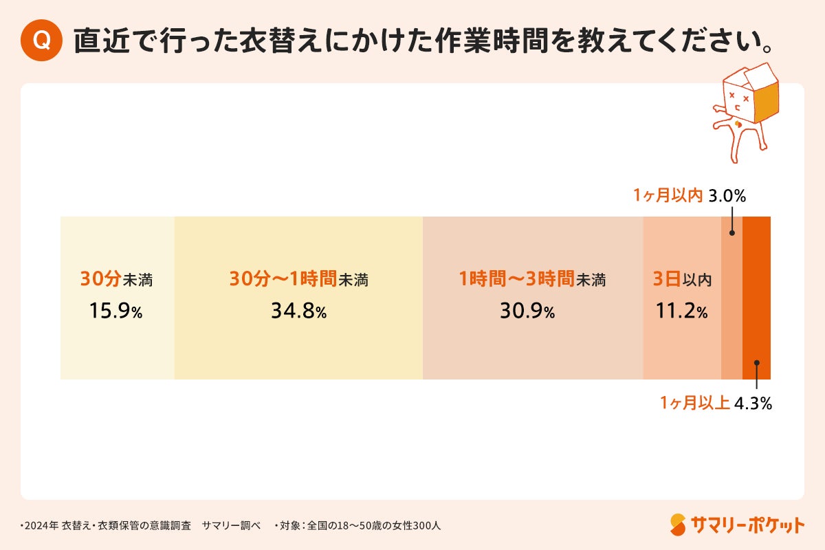 「衣替えにかけている時間」について質問すると、約9割が3日以内に完了させていますが、約4.3%の人は衣替え完了まで1ヶ月以上をかけると回答しました。