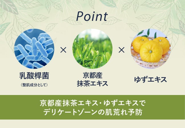 フェミニンウォッシュとオイルセラムは共に京都府の宇治市で製造されており、「京都抹茶&ゆずブレンド」は和を意識した京都由来の成分を採用した処方です。京都の名産である宇治の抹茶エキスを使用し、和の風情を感じさせるようなリフレッシュ感のあるすっきりとしたゆずの香りが特徴となっています。特に京都産の「抹茶エキス」(チャ葉エキス)は、デリケートゾーン環境を清潔に健やかに保ち、蒸れやニオイの悩みにしっかりとアプローチします。また、「ゆずセラミド」がデリケートゾーンを保湿してなめらかな状態に導きます。