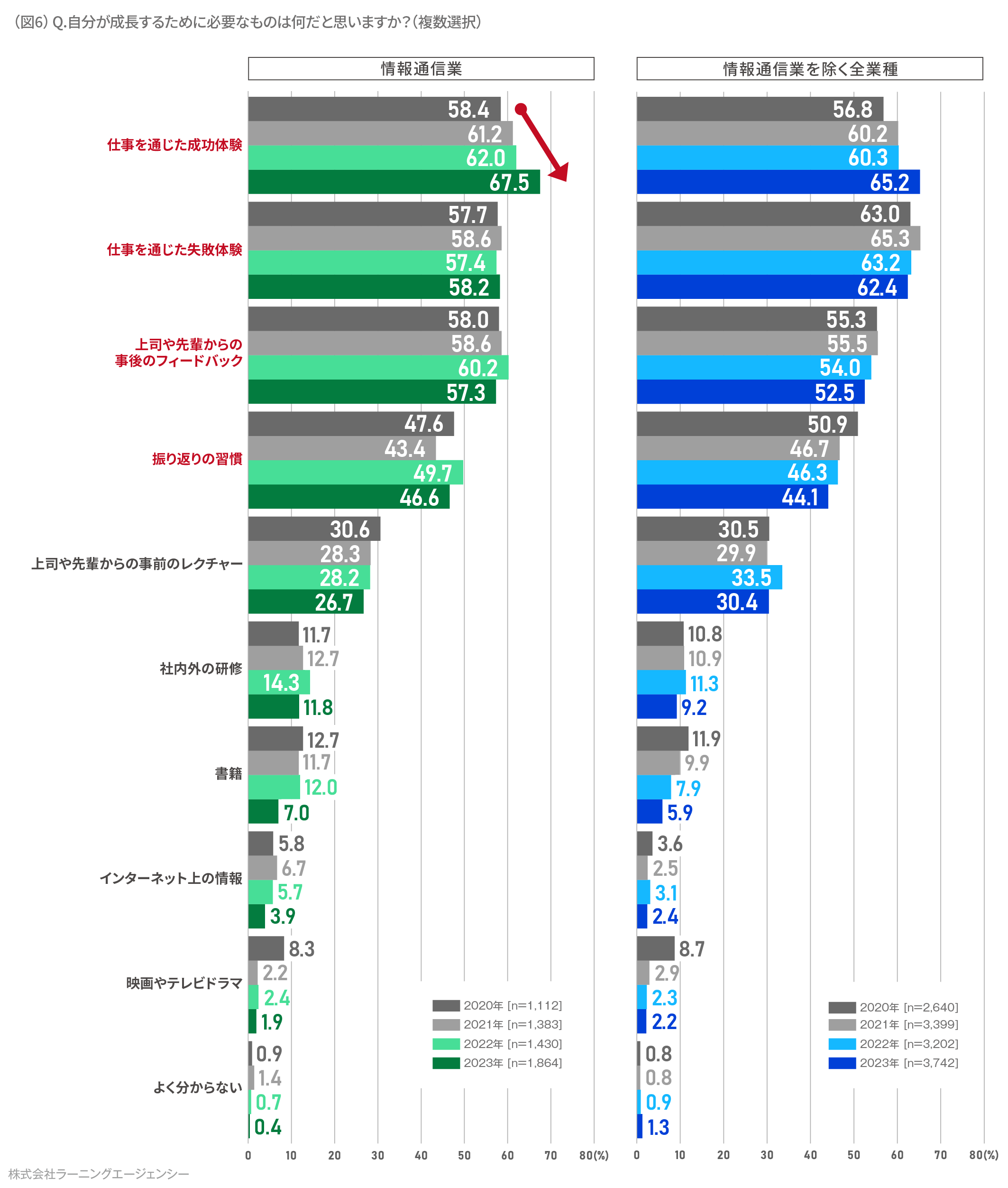 5.自身の成長に必要なこと、6 割以上が「成功体験」と回答。他業種よりも「上司・先輩からの事後フィードバック」や「振り返り習慣」を重視する結果に