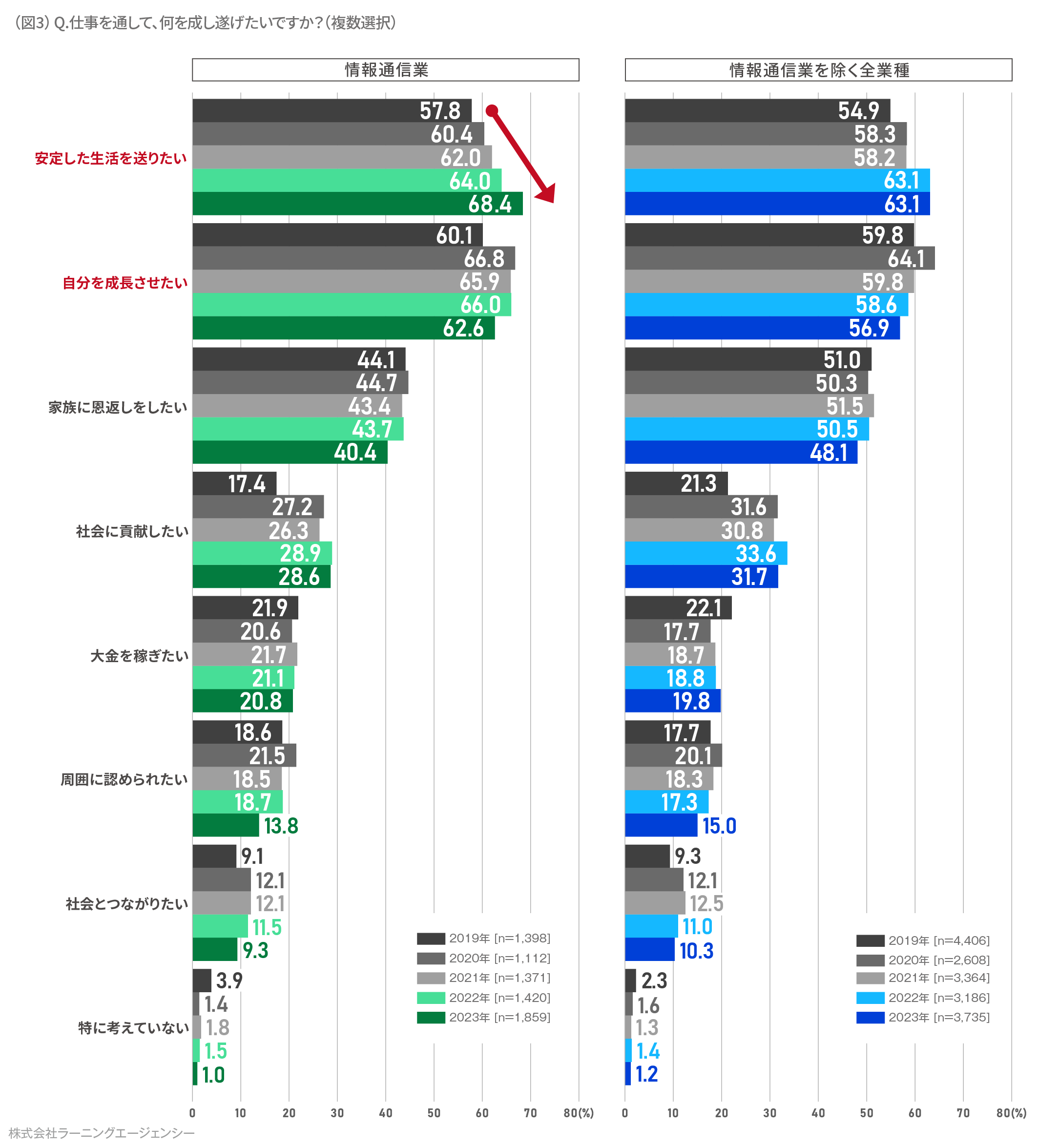 仕事で成し遂げたいこと、昨年1 位の「自分を成⾧させたい」を上回り、「安定した生活を送りたい」がトップに