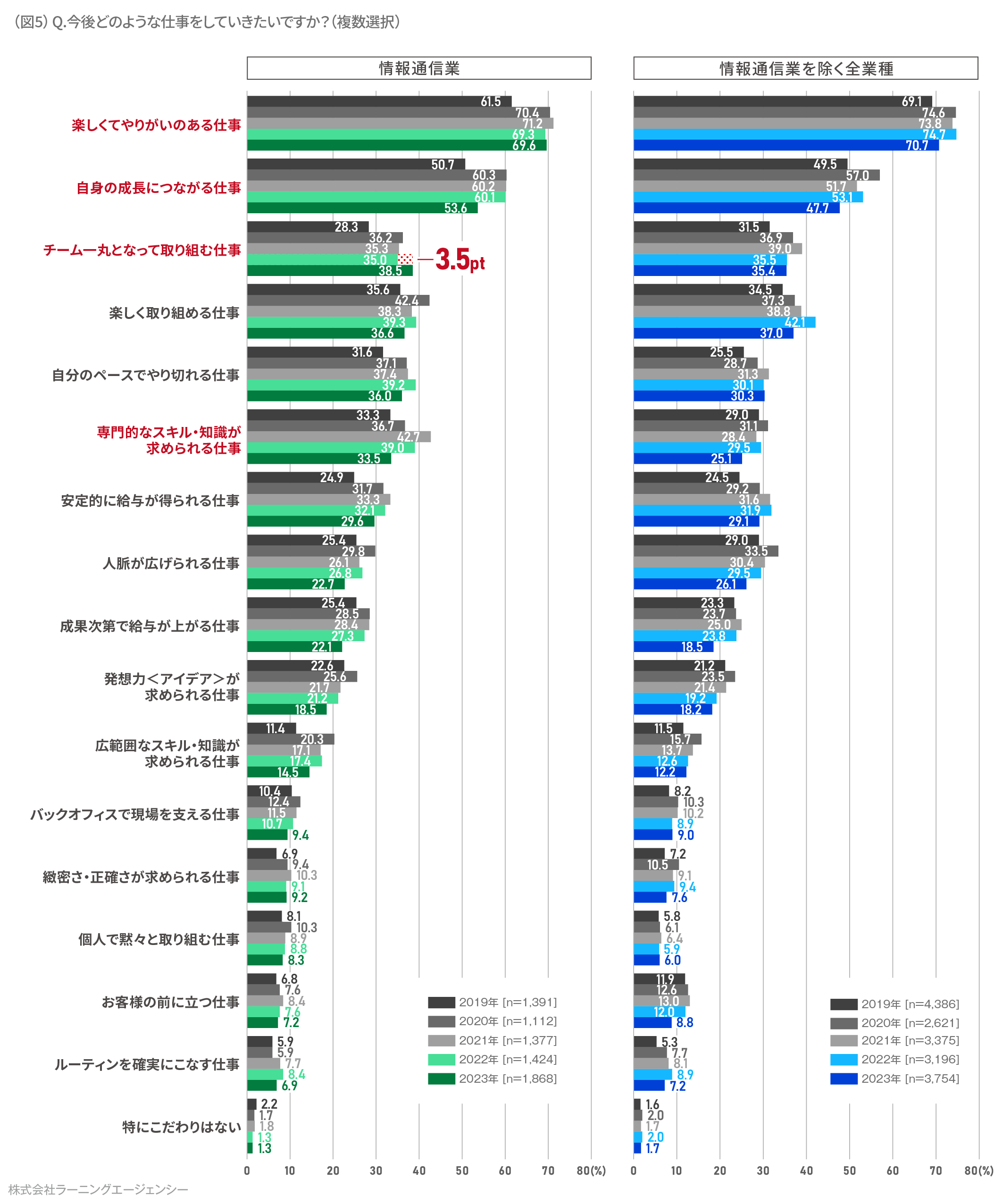 また、過去との比較においては「チーム一丸となって取り組む仕事」が昨年より3.5 ポイント増加し、他業種よりも3.1 ポイント高くなったことも特徴です。(図5)