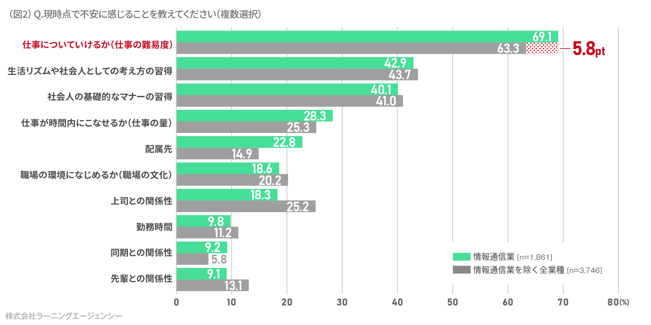 では、情報通信業の新入社員は具体的にどのようなことに不安を感じているのでしょうか。現時点で不安に感じることを質問してみたところ、「仕事についていけるか(仕事の難易度)」に不安を感じている割合が69.1%いることがわかりました。また、その割合は他業種よりも5.8 ポイント高い結果となりました。(図2)