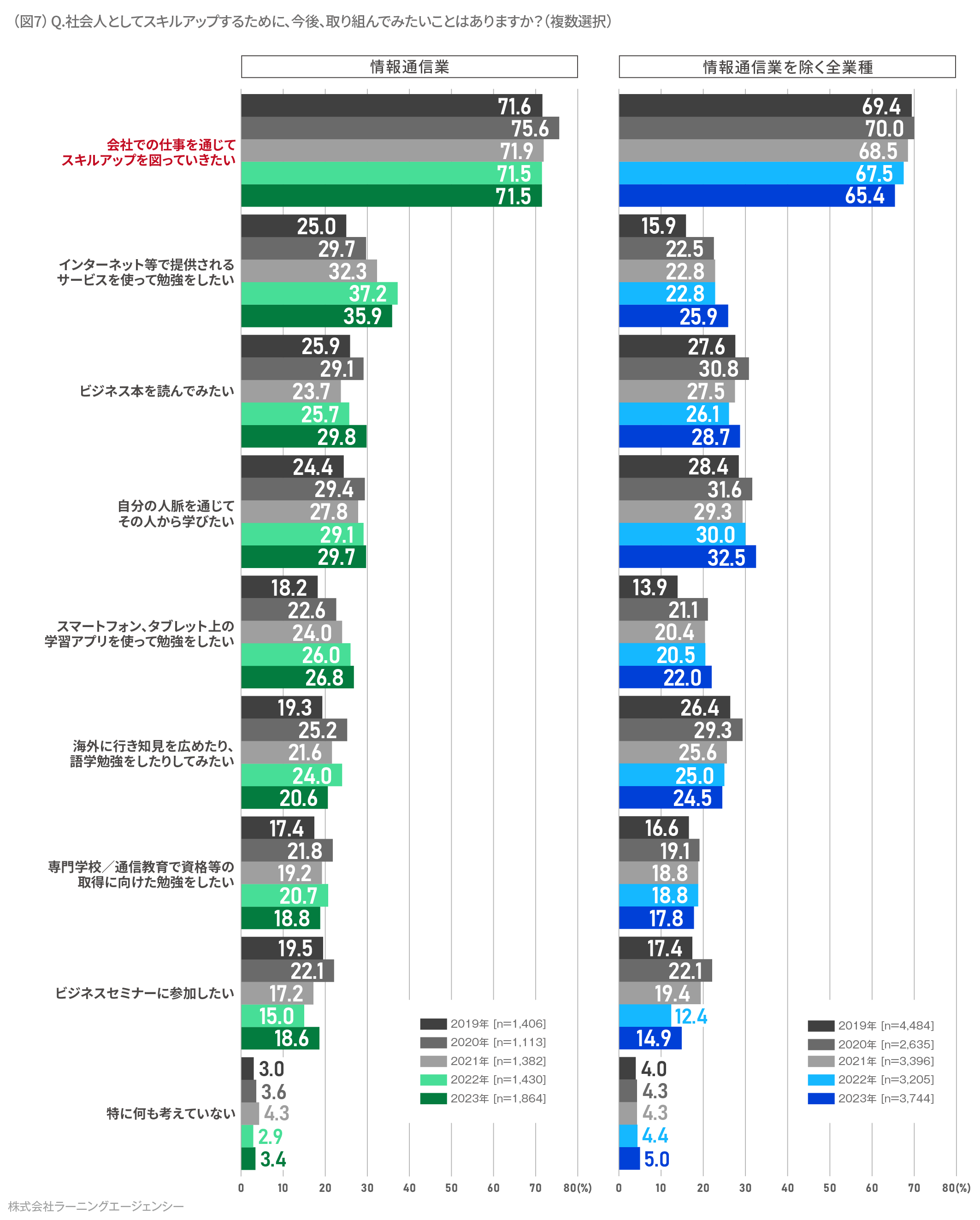 社会人としてスキルアップするために、今後、取り組んでみたいことがあるかという質問に対しても、現場体験を重視する今年の情報通信業の新入社員の志向を読み取ることができました。2023 年の回答で最も多くの回答が集まったのは「会社での仕事を通じてスキルアップを図っていきたい(71.5%)」であり、他業種よりも6.1 ポイント高い結果になりました。(図7)