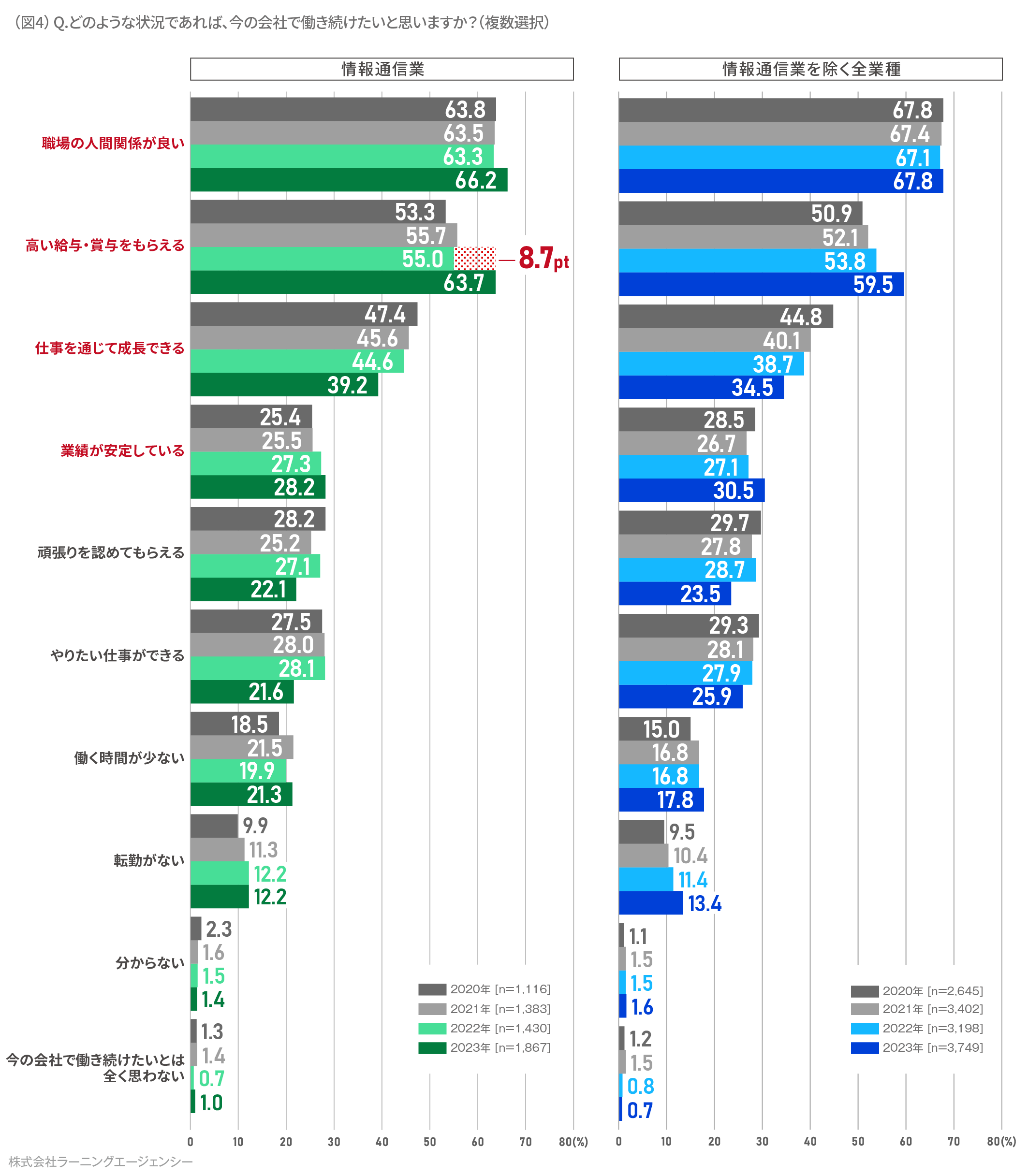 これまでに比べ安定志向が高い今年の情報通信業の新入社員は、具体的にどのような状況であれば今の会社で働き続けたいと思うのでしょうか。2020 年から4 年間の情報通信業と他業種の結果を比較しました。