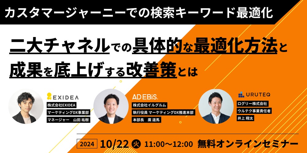 アカウントインテリジェンスツール※1『ウルテク』を提供するログリー株式会社(本社:東京都渋谷区、代表取締役:吉永浩和、証券コード:6579、以下、ログリー)と世界最高峰のマーケティングイノベーションを提供する株式会社EXIDEA(本社:東京都中央区、代表取締役社長 小川 卓真、以下EXIDEA)、広告効果測定プラットフォーム「アドエビス」を提供する株式会社イルグルム(本社:大阪府大阪市北区 代表取締役:岩田 進、以下「イルグルム」)は、「【カスタマージャーニーでの検索キーワード最適化】二大チャネルでの具体的な最適化方法と成果を底上げする改善策とは」というテーマの無料のオンラインウェビナーを開催します。