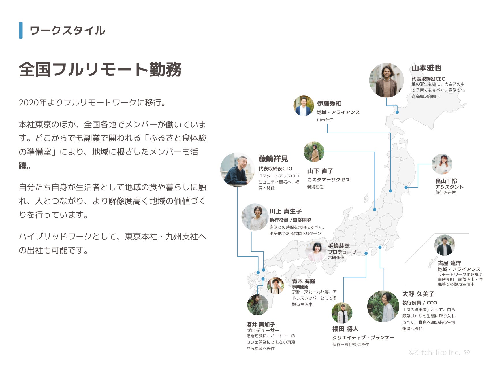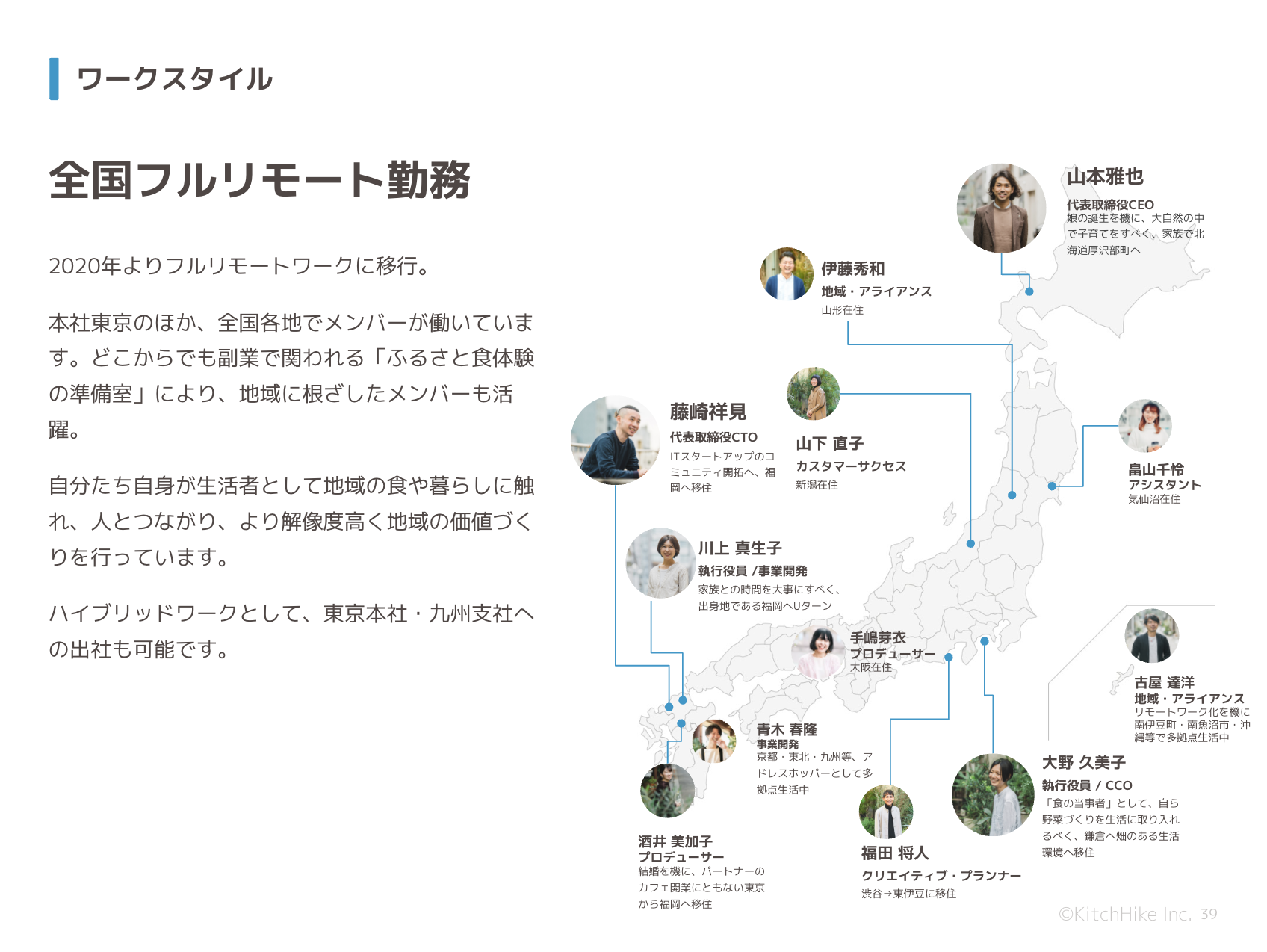 キッチハイクでは2020年よりフルリモートワークに移行。私たち自身が地域の食や暮らしに触れることで、手触りを持った価値づくりを大切にしています。