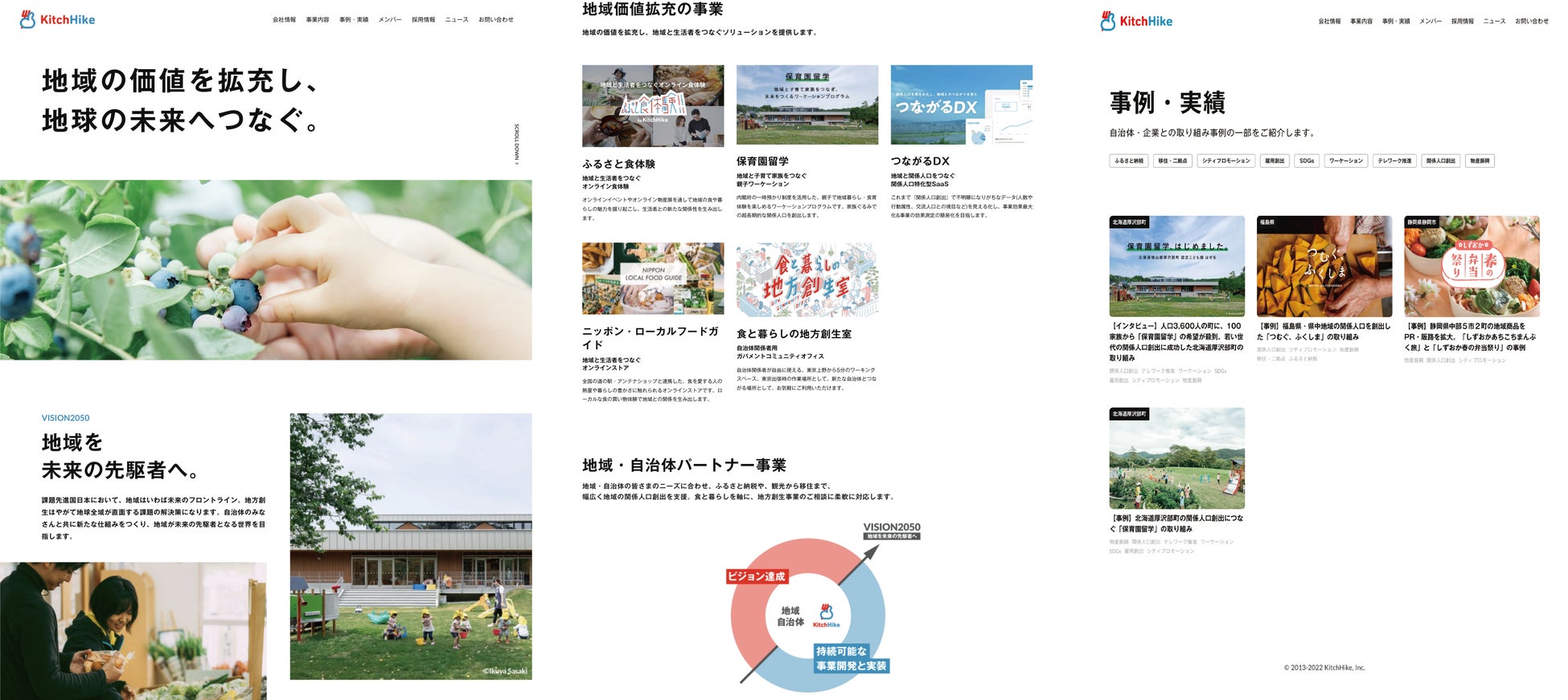 株式会社キッチハイクは「地域の価値を拡充し、地球の未来につなぐ」をミッションにした、地域と人生をつなぐ、食と暮らしの発明・実装カンパニー。食を軸に関係人口及び地域価値の創造を目的にした自治体連携サービス「ふるさと食体験」を運営する。2021年10月に「ふるさと食体験」の価値から派生した親子ワーケーション「保育園留学」をリリース。家族ぐるみでの超長期的な関係人口を創出できるということから内閣府の「地方創生SDGs官民連携プラットフォーム」優良3事例に選ばれ、現在2022年10月まで満席でキャンセル待ちとなっている。また、2021年12月には関係人口を可視化・分析する「つながりDX」β版をリリース。2022年度内に100自治体との連携を目指す。