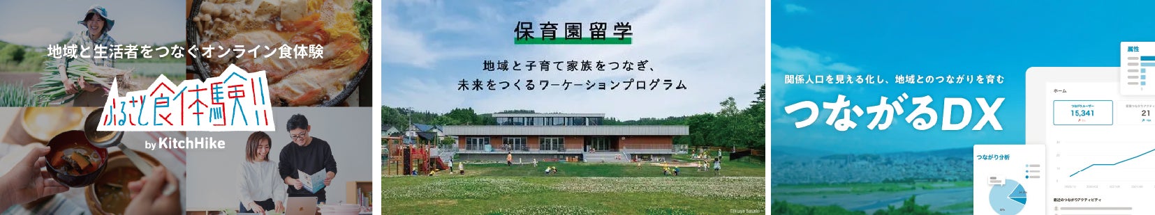 キッチハイクは2013年に食のユーザー向けサービスをスタート。2020年から開始した地域と生活者をつなぐオンライン食体験「ふるさと食体験」を皮切りに、2021年に地域と子育て家族をつなぐ親子ワーケーション「保育園留学」、関係人口を可視化・育成する関係人口特化型SaaS「つながるDX」をリリース。食のサービスから「食と暮らし」全域の自治体向けソリューションへ拡張し、60以上の地域と一緒に未来を実装して参りました。