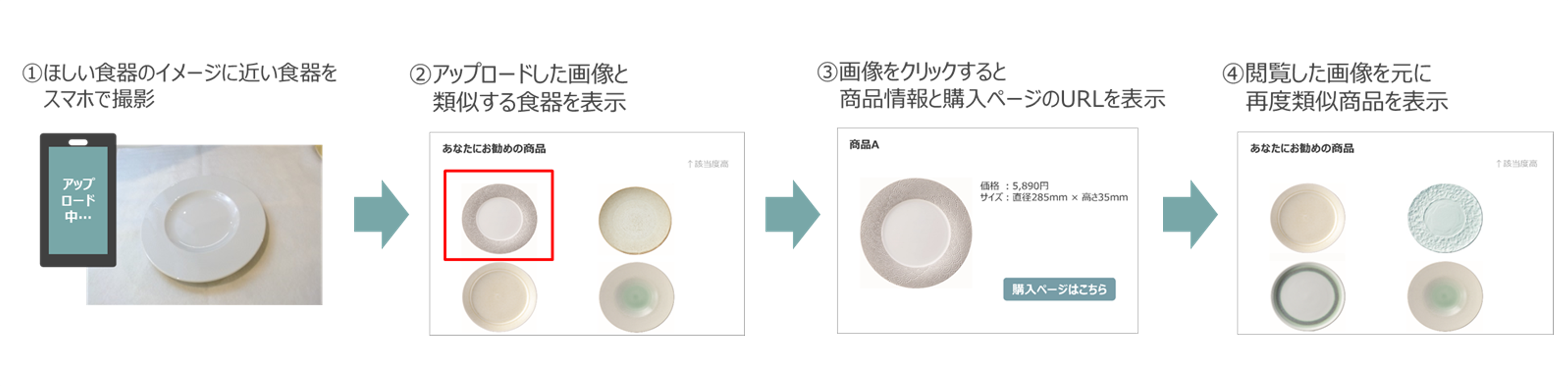 アップロードした画像と類似する食器を提案するだけでなく、食器ソムリエの知識をAIに学習させることで、食器ソムリエが実際に提案するように食器を探し出します。これを通して、お気に入りの食器を「見つける楽しみ」と「過ごす楽しみ」を支援します。