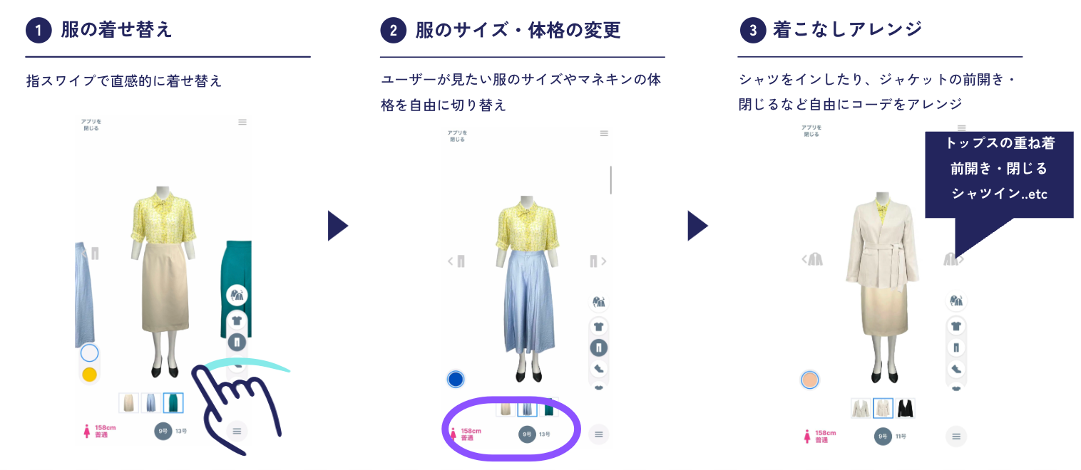 サイズごとや体型ごとの着用イメージはもちろん、シャツイン・ジャケットの前開きなどの有無など細かい着こなしまでコーディネートを確認できます。指スワイプなどの直感的な操作で、気軽に楽しくコーディネートを確認していただけるので、ECサイトの滞在時間・回遊性アップにもつながります。