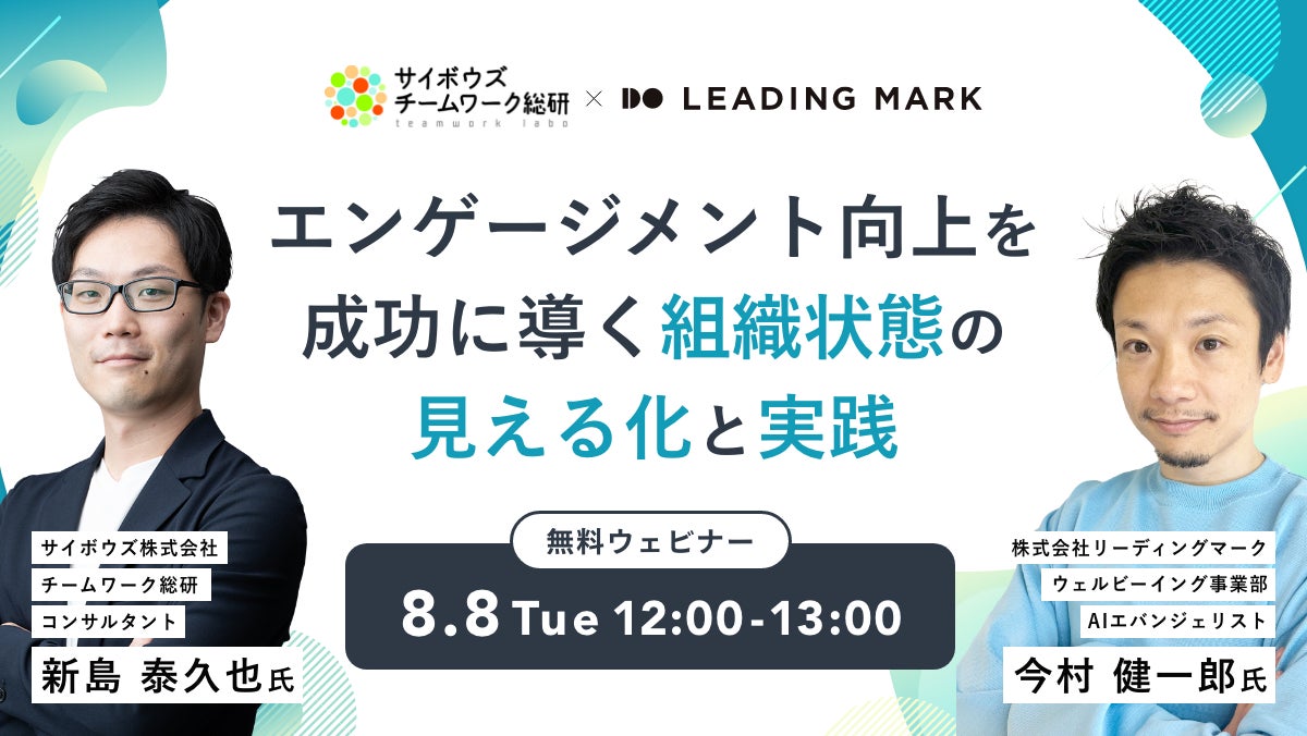 Personality Techを通じたHR事業「ミキワメ」を提供する株式会社リーディングマーク(本社:東京都港区、代表取締役社⻑:飯⽥ 悠司、以下リーディングマーク)は、企業の⾃律型組織づくりを伴走支援するサイボウズ株式会社 チームワーク総研と2023年8月8日(火)12:00~13:00にて、「ウェルビーイング」にまつわるオンラインセミナーを開催します。▼詳細はこちらhttps://to.leadingmark.jp/20230808.html?utm_contents=pr0802