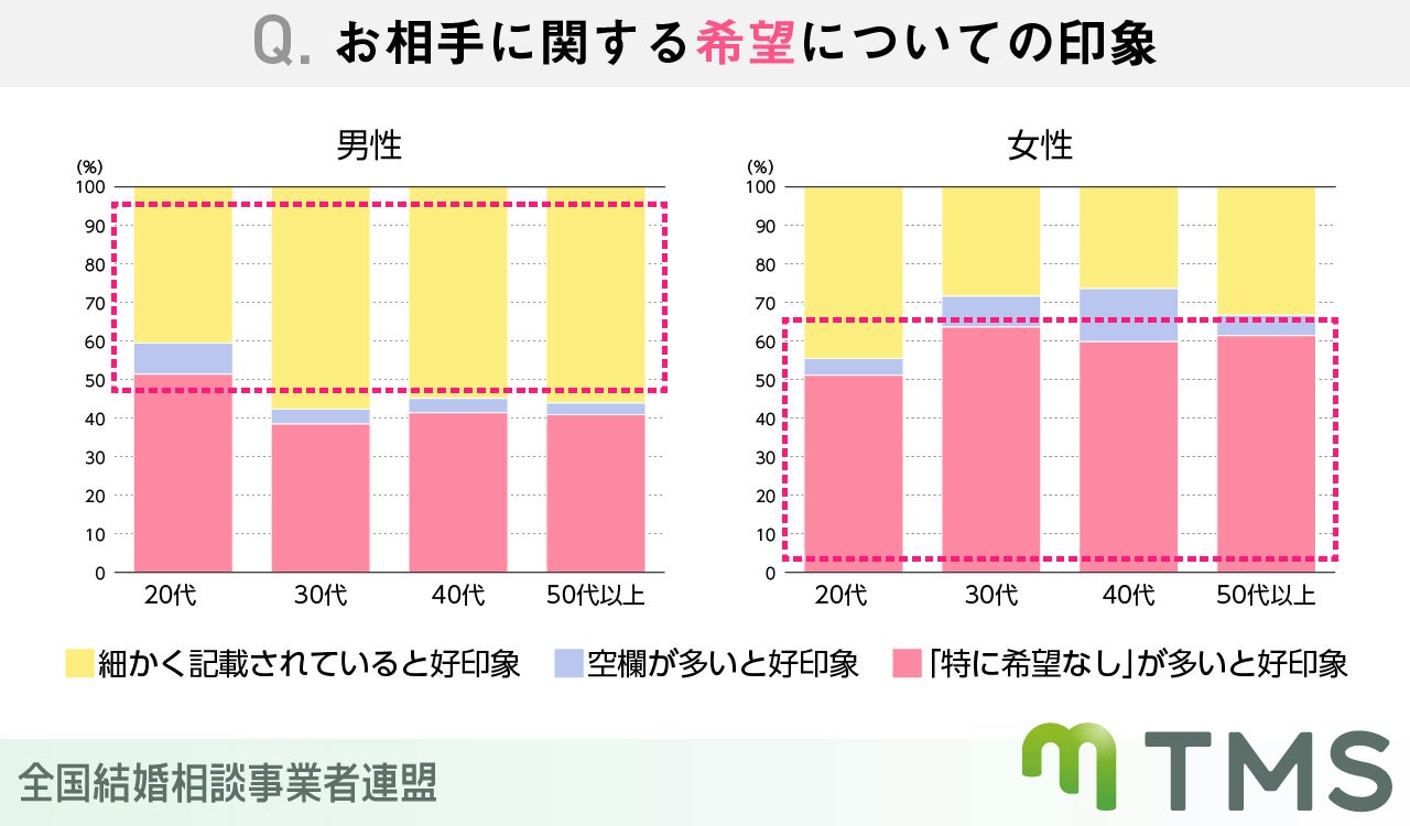 お相手希望の書き方について、男性は細かく記載されていると好印象、女性は「特に希望なし」が多いと好印象、と男女で回答が分かれました。