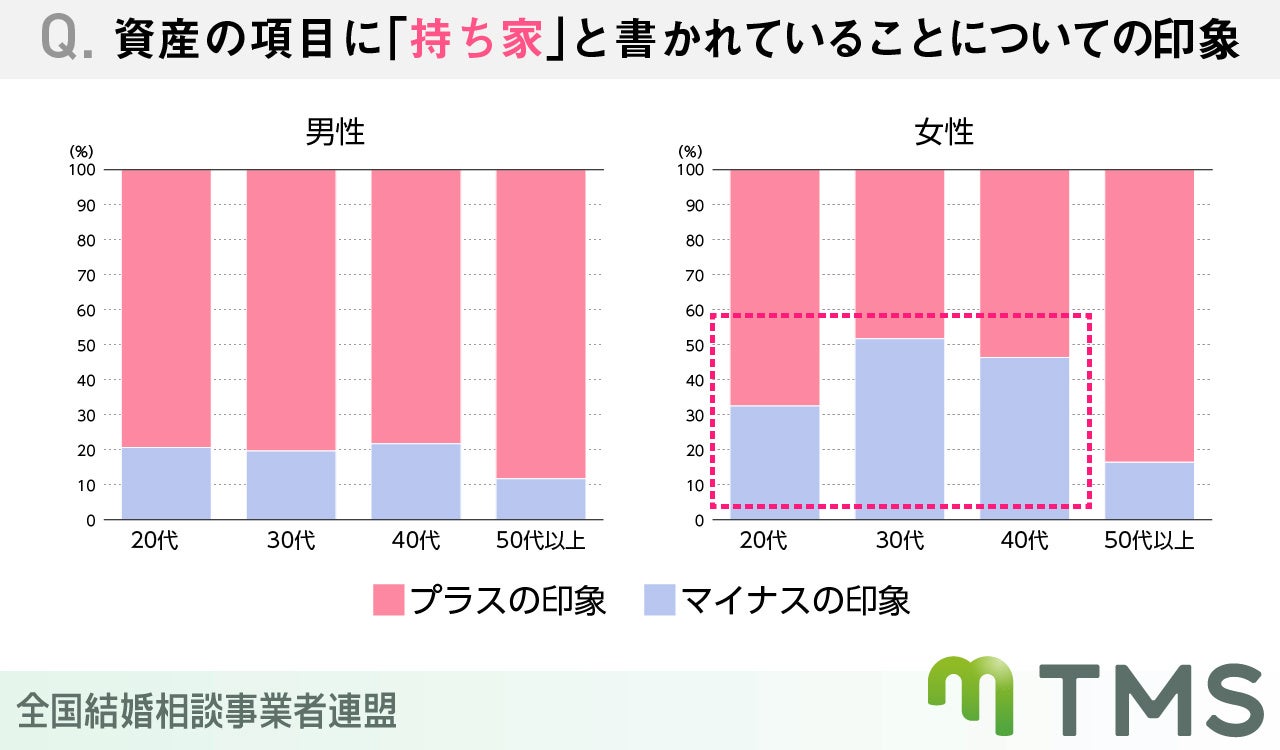 資産の項目に「持ち家」と書かれているプロフィールについて、男性はプラスの印象を8割以上もつ一方で、女性は30‐40代を中心に約半数がマイナスの印象を持つことがわかりました。女性は結婚後の住居が限定されるイメージをネガティブにとらえる方も一定いることが想定されます。