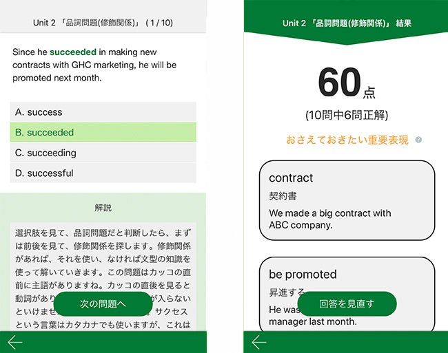 本番と同様に4択問題が出題されます。 1問ごとにワンポイント解説が付いており、10問で1Unitです。 1Unit毎に重要表現をリスト化するので、後から重要表現だけ 復習することが可能となります。