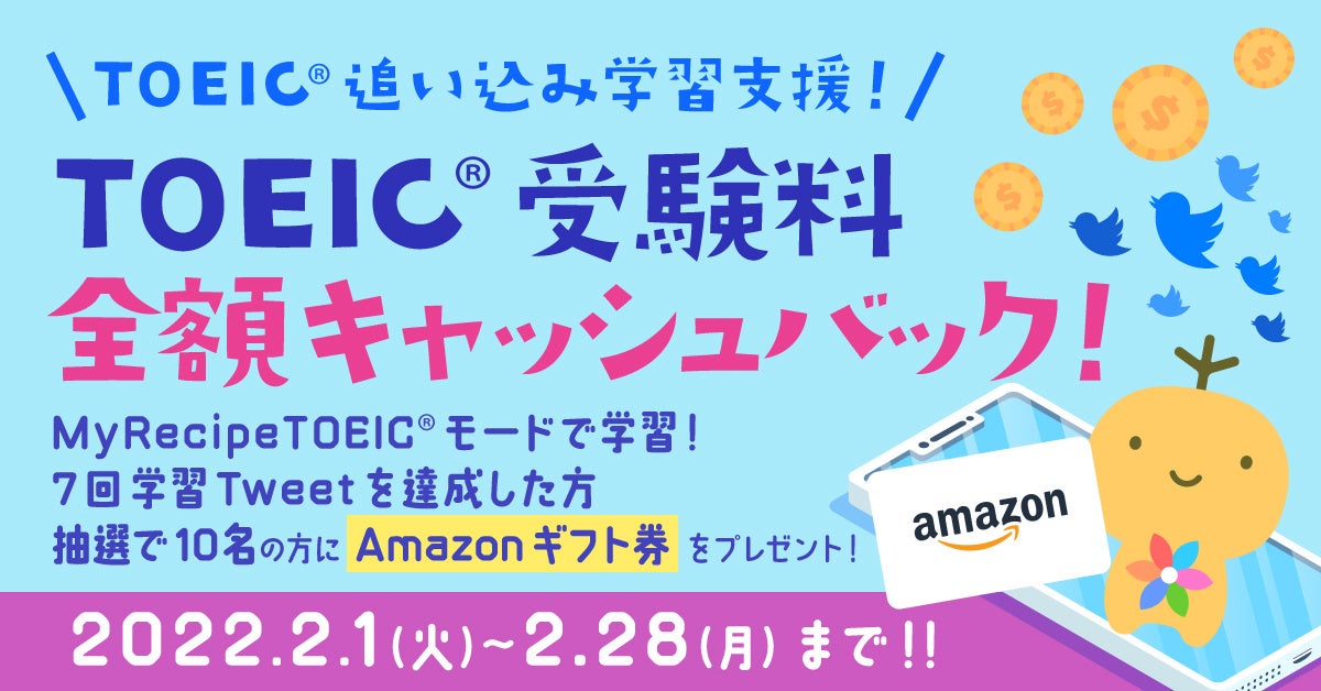 株式会社ポリグロッツ(本社:東京都新宿区、代表取締役:山口隼也)は、英語学習アプリ レシピー にて MyRecipe TOEIC®︎ モードで学習しているお客様を対象に、抽選で10名の方にTOEIC®︎受験料相当額のAmazonギフト券( TOEIC Listening & Reading Testの受験料の¥6,490円)をプレゼント致します。