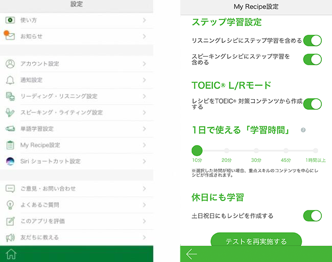 1. 設定メニューの「My Recipe設定」メニューをタップして選択し、 「TOEIC®︎ L/Rモード」をタップして選択してください。 その後、「テストを再実施する」をタップして選択して下さい。
