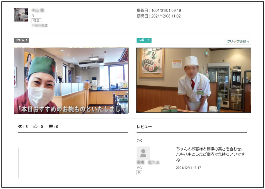 ランクアップには、テストをクリアする必要があります。例えば前座見習いのテストでは、「お客様のお出迎えとご案内」が出題され、その様子を動画で投稿レポートとして上長や本部スタッフよりお手本動画と比較したレビューコメントと合否判定が返される仕組みになっています。