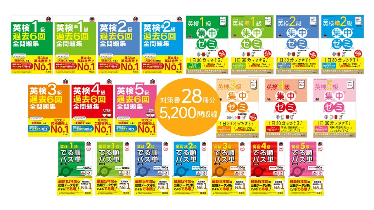 本作は、英検対策に定評のある旺文社が刊行する『英検®過去全問題集』や『英検®でる順パス単』等、28 冊分のコンテンツを収録した英検対策ソフトです。