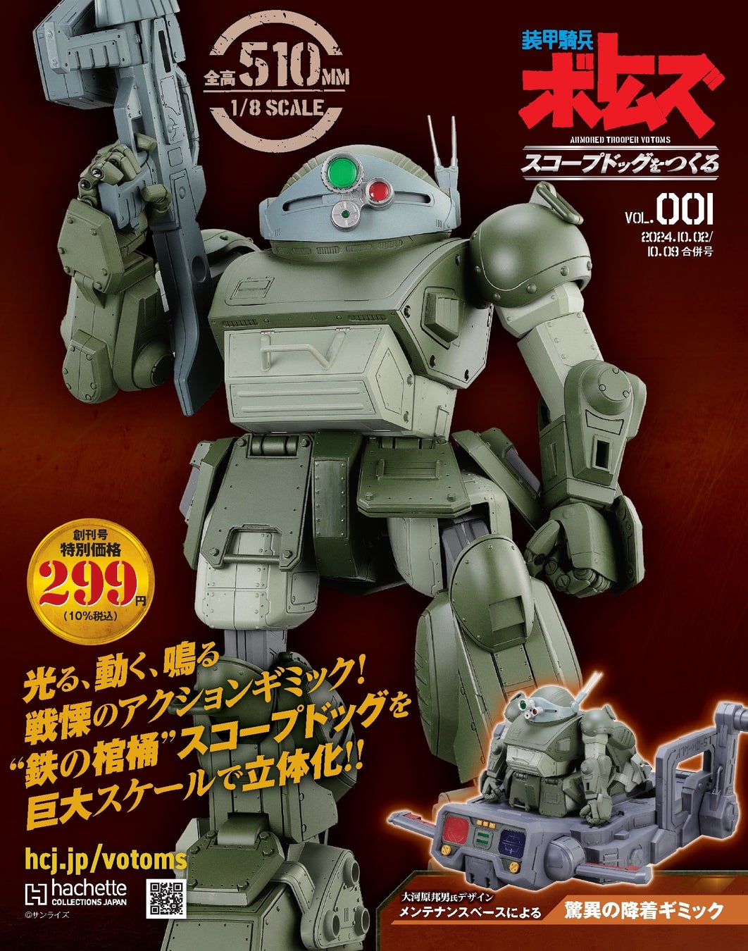アシェット・コレクションズ・ジャパン株式会社は、『装甲騎兵ボトムズ スコープドッグをつくる』を2024年9月25日(水)に創刊します。毎号付属のパーツを組み立てると、1/8スケール(全高51cm)に及ぶ大迫力モデル「スコープドッグ」と、本モデルオリジナルデザインのメンテナンスベース(専用台座・全高14cm)が完成するシリーズです。
