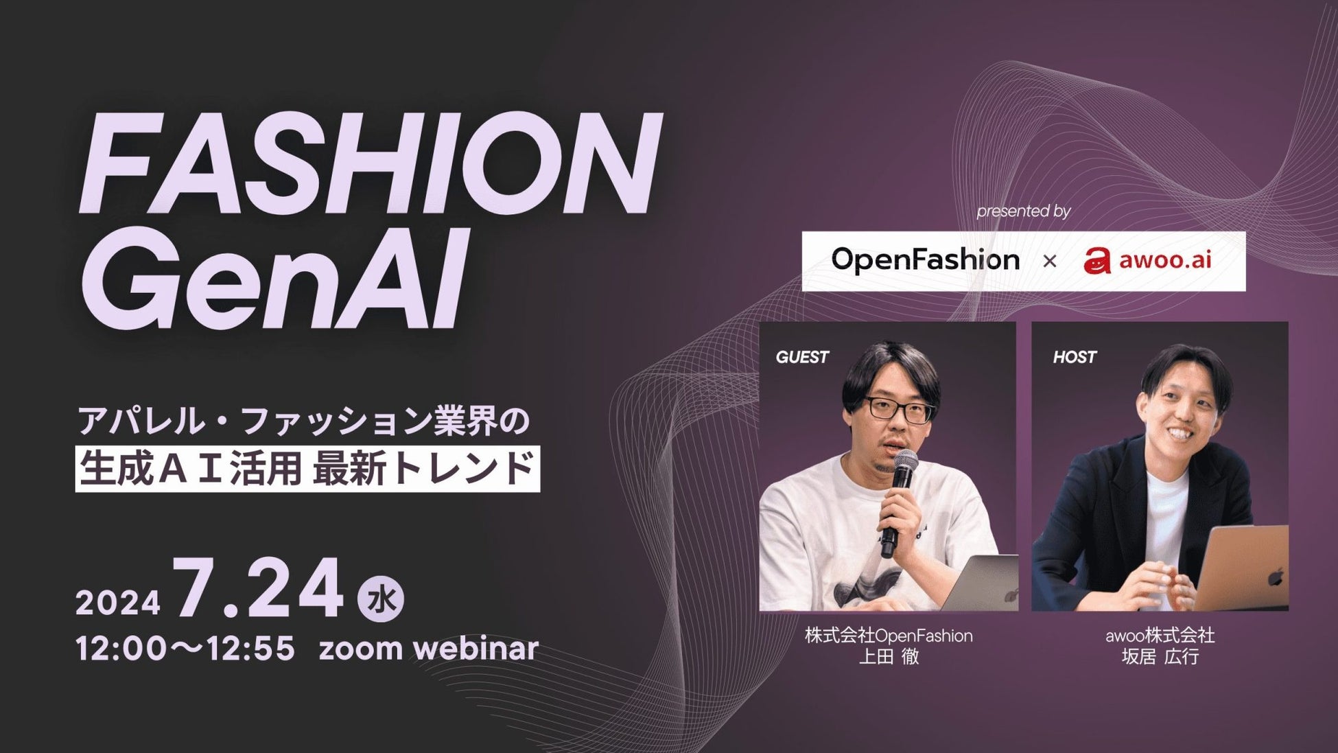 今回は、DXとAI技術でファッション業界の革新に挑むOpenFashion(Maison AI)と、ファッション・アパレル業界を中心に100社以上のECサイトを支援するawoo(awoo AI)の共催で、生成AIの最新技術進歩やファッション業界での活用トレンド、そしてAIの実践的な活用事例について、詳しくご紹介します。
