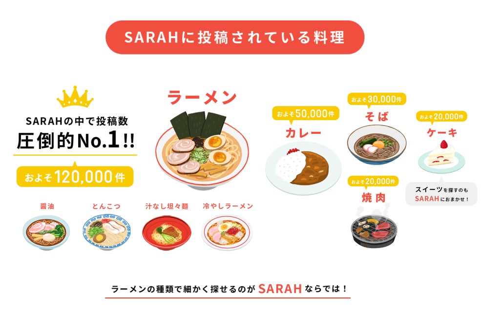 様々なジャンルの料理がSARAHに投稿されています。中でもラーメンは圧倒的に投稿数が多い傾向です。他にもカレー、そば、ケーキ、酢豚、オムライス、コーヒー等…その日の食の気分に合わせて、メニューベースで探す際にもおすすめなサービスです。