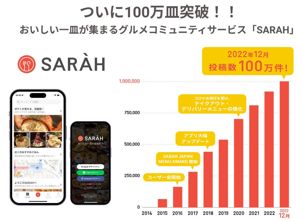 株式会社SARAH(本社:東京都千代田区、代表取締役:髙橋洋太)は、おいしい一皿が集まるグルメコミュニティサービス「SARAH」に寄せられた口コミの累計投稿数が100万件を突破したことをお知らせいたします。