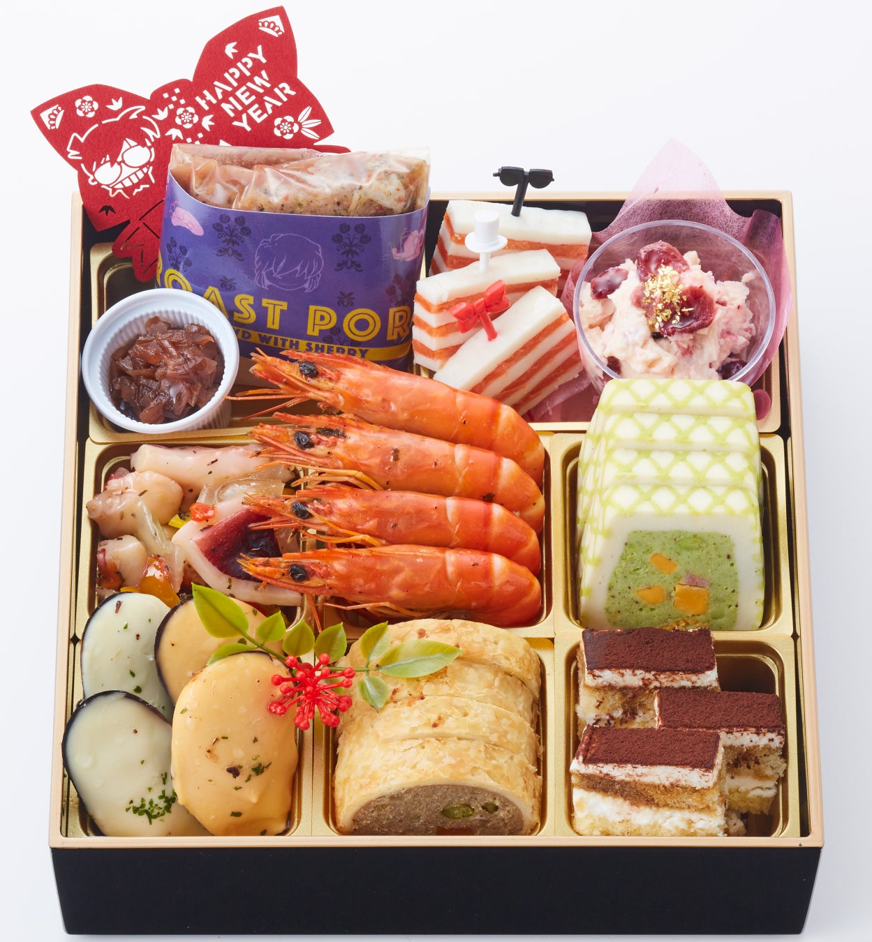 灰原哀(シェリー)から着想したシェリービネガーソースを添えたローストポークや赤井秀一イメージの海老の香草オイル漬け、蝶ネクタイ型変声機や怪盗キッドのシルクハットモチーフのピックが付いた紅鮭ミルフィーユなど、おせちの概念から一歩飛び出してアレンジした洋風の美味を詰め込みました。素材とキャラクターの出会いやストーリーを推理してみるのも楽しいお重です。