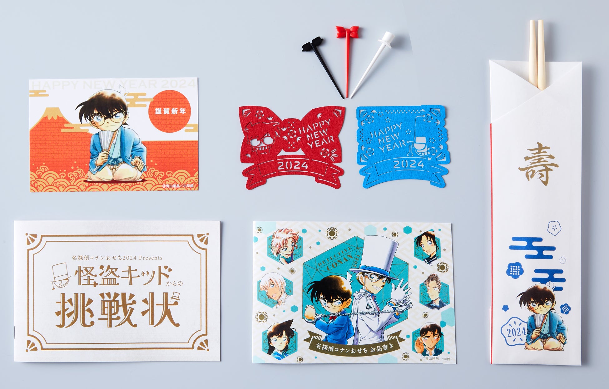 お正月気分が一気に盛り上がる青山先生のメッセージ入りの年賀状、お重と同じデザインのお品書き、謎解きも楽しめる「怪盗キッドからの挑戦状」、新年の気持ちも引き締まる江戸川コナンのイラスト入り祝箸など、ここでしか手に入らないオリジナルグッズが盛りだくさん!