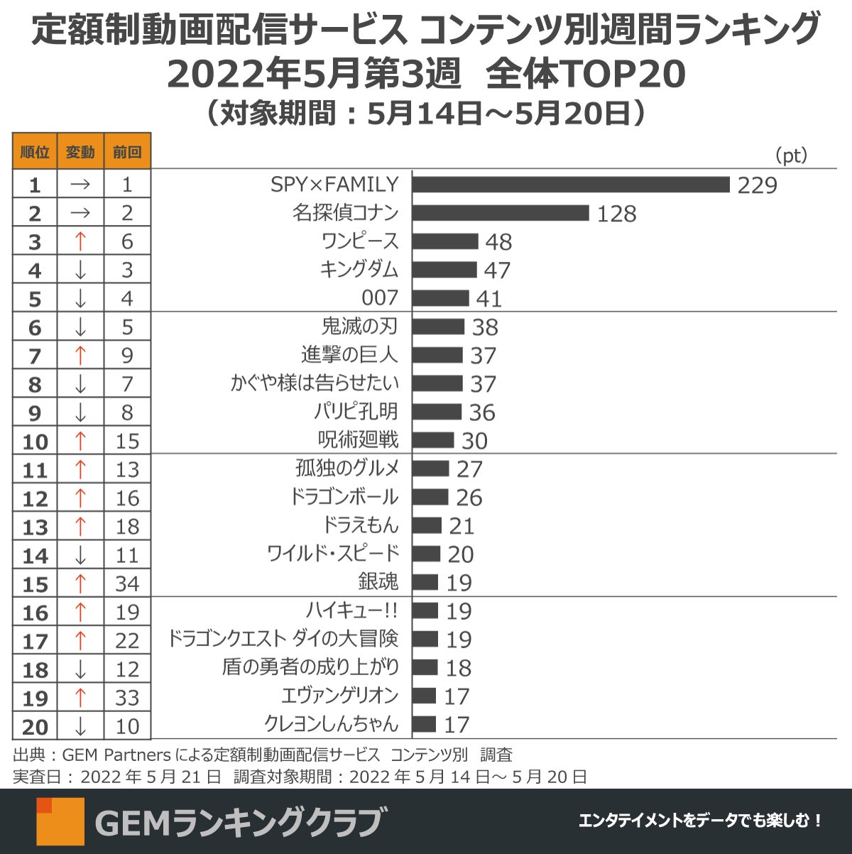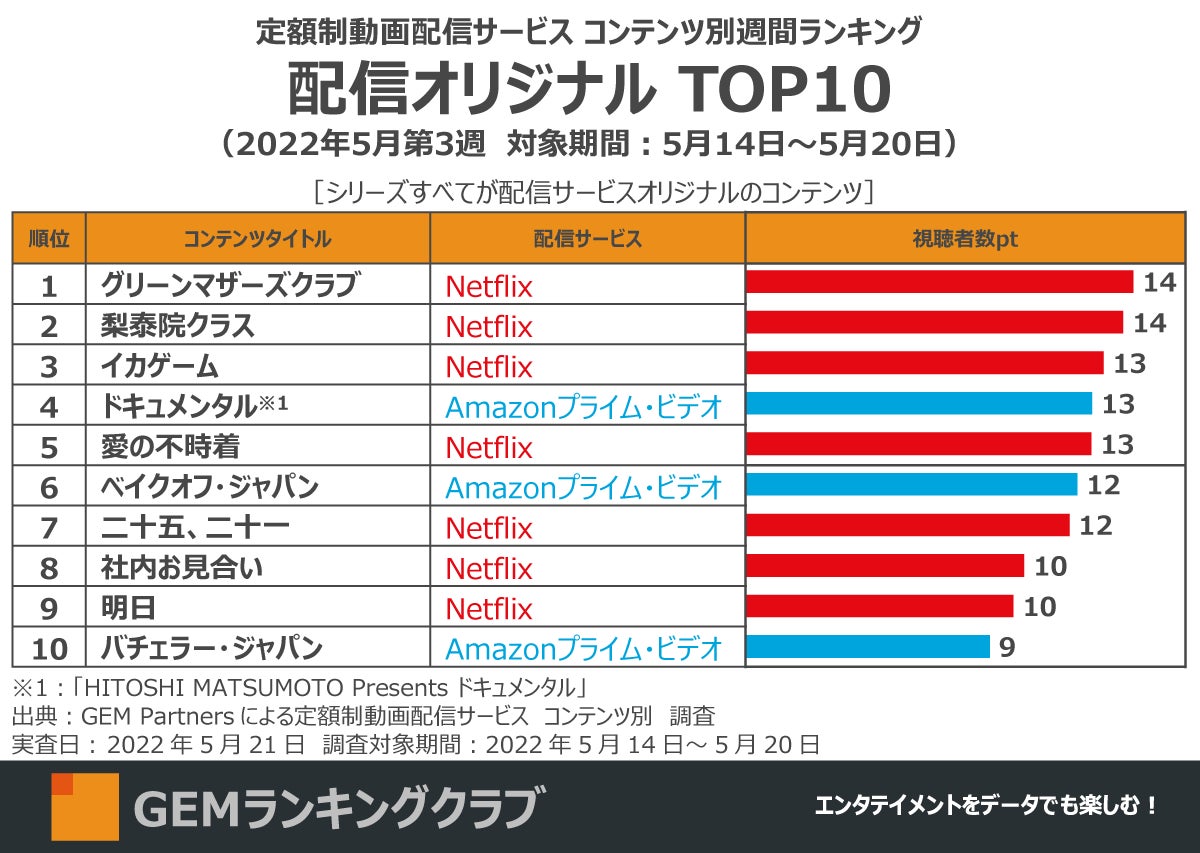 エンタテイメント業界に向けたデータ×デジタルマーケティングサービスを提供するGEM Partners株式会社(ジェムパートナーズ、所在地:東京都港区、代表取締役:梅津文)は5月26日(木)、エンタメコンテンツランキングやデータ情報を発信する「GEMランキングクラブ」プロジェクトにて作成した2022年5月第3週の「定額制動画配信サービス コンテンツ別週間ランキングTOP20(調査対象期間:5月14日~5月20日、調査対象:日本在住15~69歳男女)」を発表します。