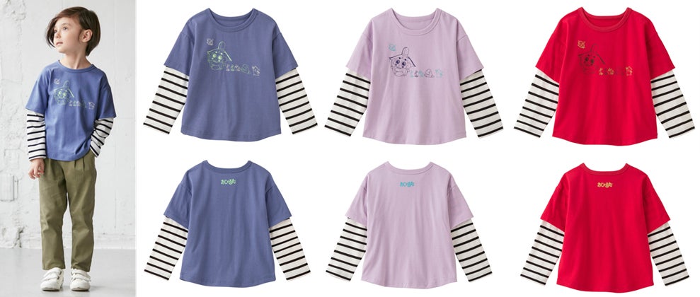袖部分がボーダーになっているレイヤード風Tシャツ。幼いデザインにならないように、身頃のキャラクタープリントは2色使いで配色にこだわりました。また、後ろ襟下のロゴプリントもポイント。