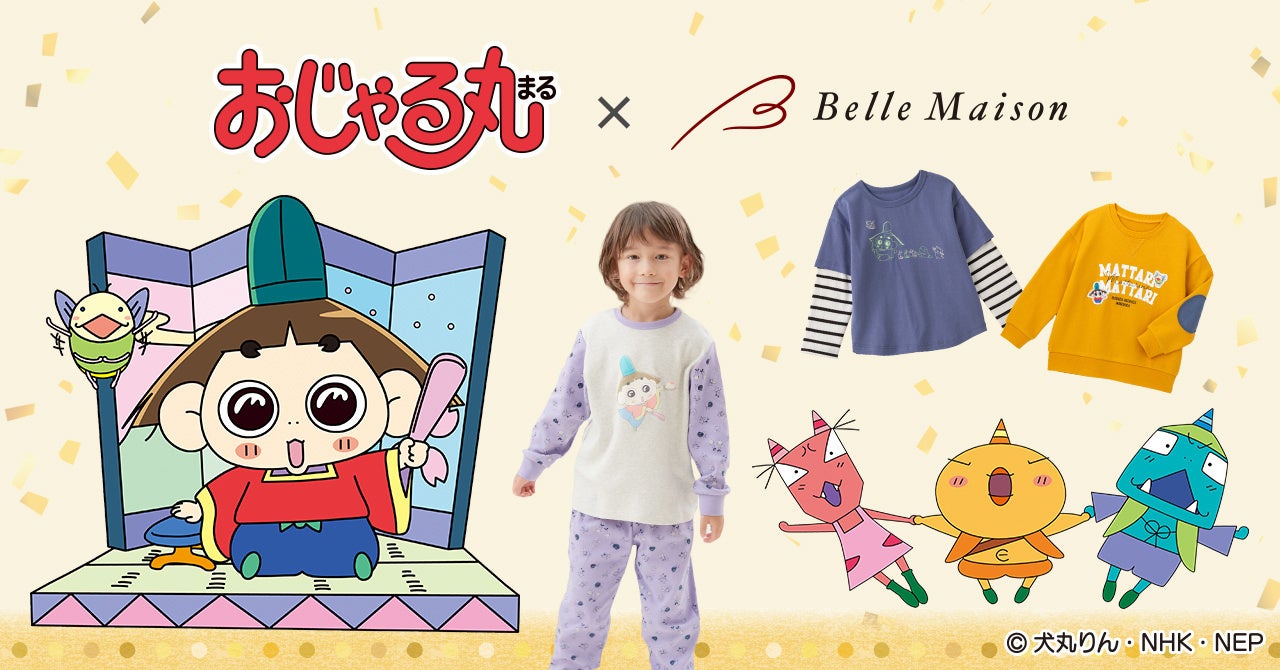ベルメゾンでは、2019年よりNHKの幼児番組「いないいないばあっ!」や「みいつけた!」、またNHK Eテレのアニメ番組「忍たま乱太郎」のオリジナルウェアを展開し、人気を博してきました。今回は、今年で放送25周年を迎える「おじゃる丸」のオリジナルキッズウェアを発売します。