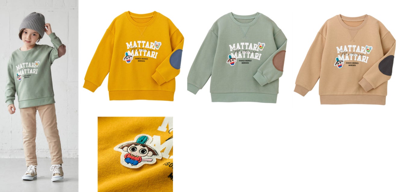 ひじパッチの配色がおしゃれ。身頃にはメインキャラクターの刺しゅうワッペン付き。英語部分はオープニングの歌の歌詞「まったりまったりまったりな~♪」をローマ字にしてプリントしました。
